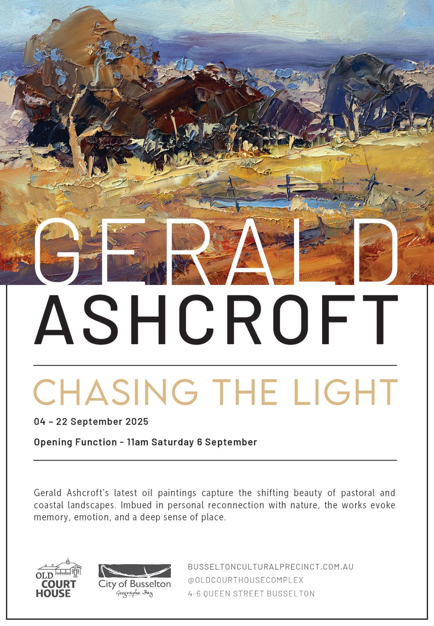 An opening function will be held on Saturday 6 September at 11am, o ering visitors an opportunity to meet the artist, view the exhibition, and enjoy light refreshments in the historic surrounds of the Old Courthouse Complex.