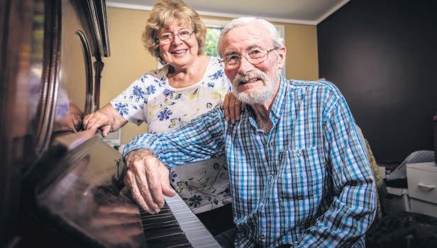 Ken Ackerman and Kathy Smith with Ken’s piano in their shed. Image supplied.