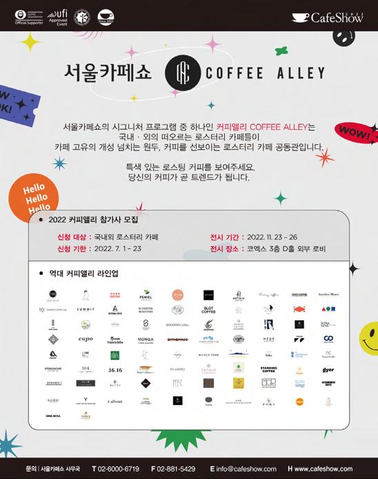 6 52 5. "Thank You, Coffee" Green Campaign 07 EXHIBITION The 21st Seoul Int'l Cafe Show 2022 22 1 Exhibitor List 48 4. Business Matching Program • Cafe Show Mocha Port • Amazon Export Seminar • Export Business Meeting with KOTRA 86 2023 Co ee Industry Keyword "N.E.W.E.R.A" 15 Show Analysis • Fact Sheet • Survey 34 3 Showcase • Cherry's Choice • Cafe Show Excellence Awards • Trend Unpacked Show 2023 55 CONFERENCE The 11th World Coffee Leaders Forum 67 EVENT World Latte Art Battle & Korea Coffee League 10 Show Composition • Schedule • Show Composition & Entrance Guide • Floor Plan 31 2 On·Offline Hybrid Cafe Show • YouTube Virtual Tour • Kakaomakers Online Fair 61 FESTIVAL The 7th Seoul Coffee Festival 70 Marketing Activities CONTENTS