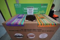 전시회 특성상 많이 배출되는 커피박 재활용을 위해 재생소재 종이로