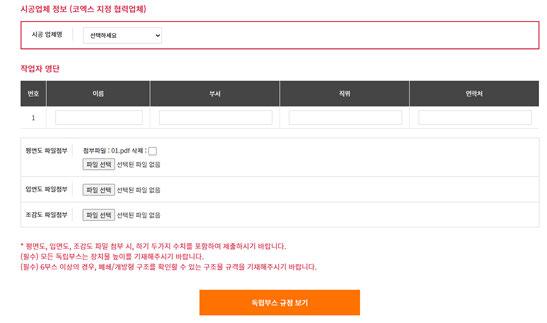 ■ 모든 독립 부스는 COEX 홀매니저의 확인을 위해 부스 높이, 재질 등이 표시된 부스설계도면을 서울카페쇼 사무국으로 기한 내 제출하여야 합니다.