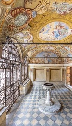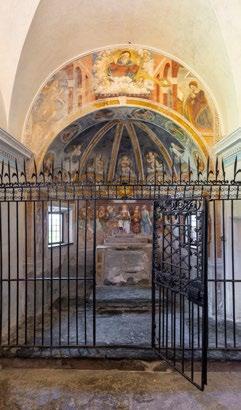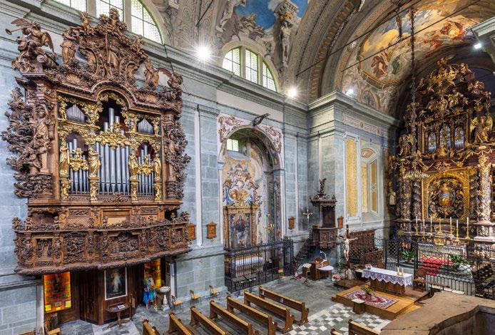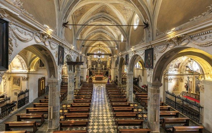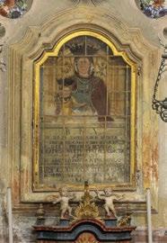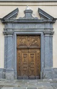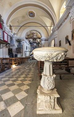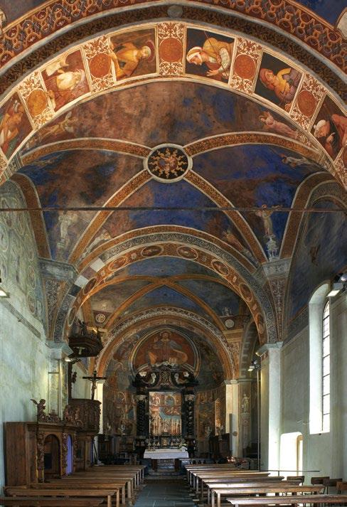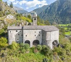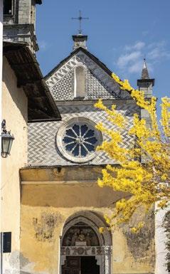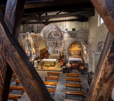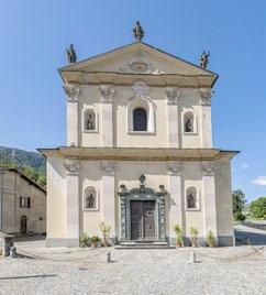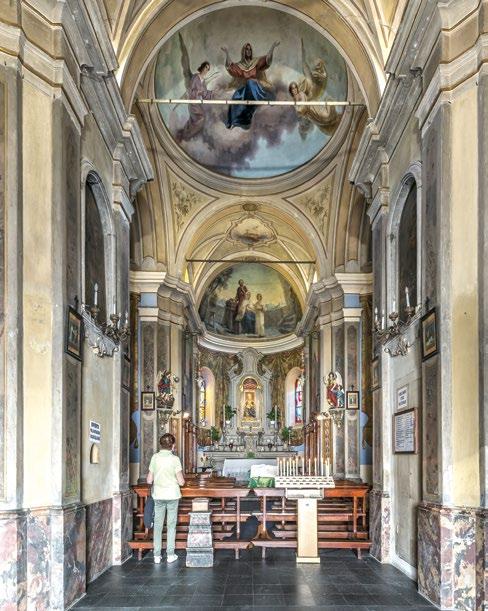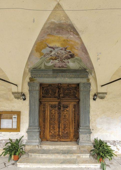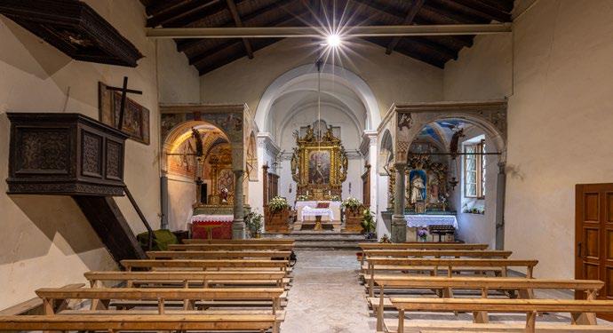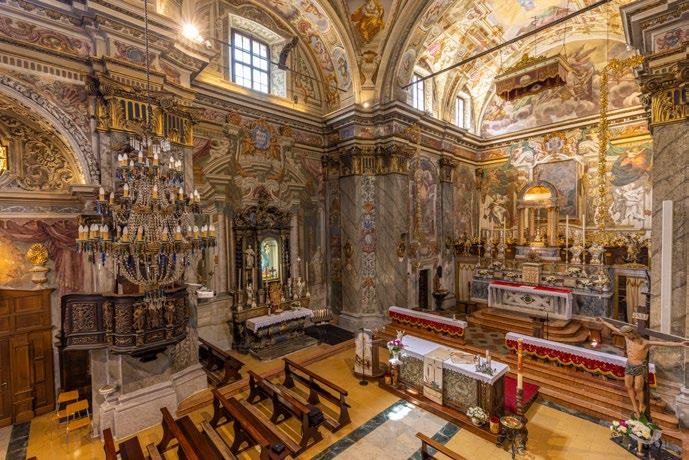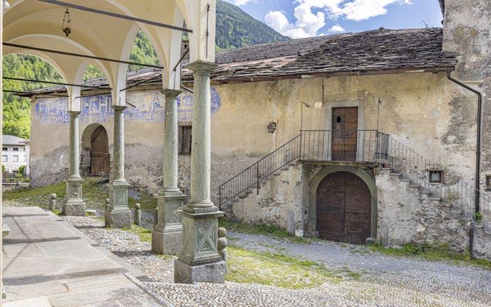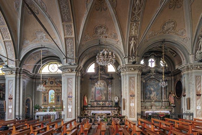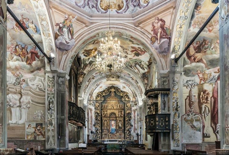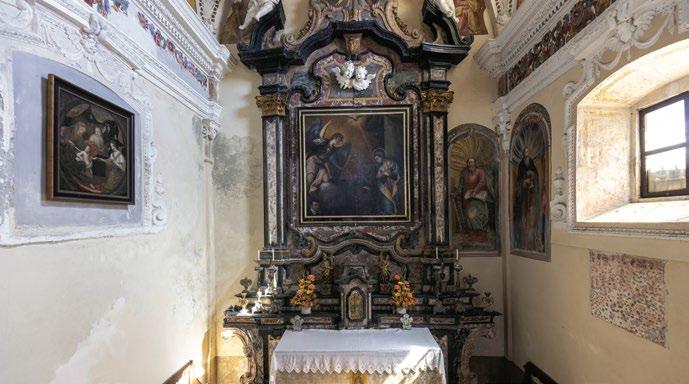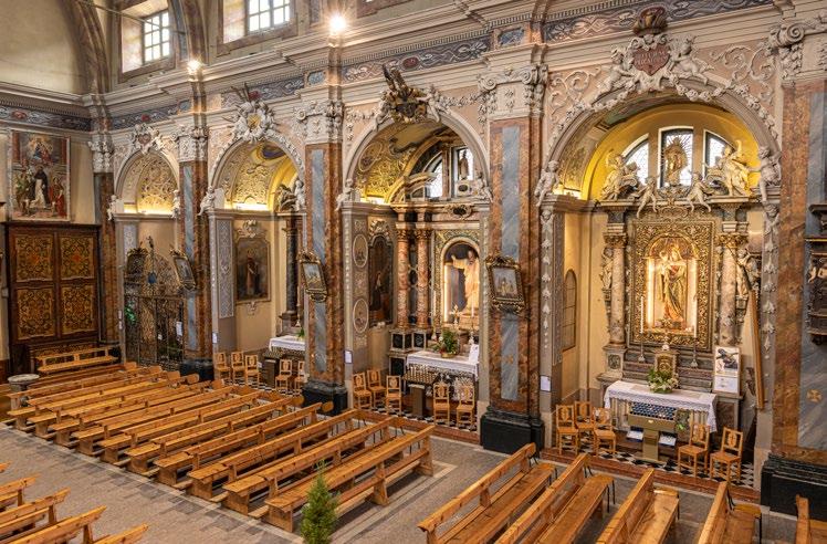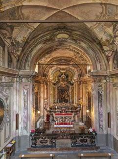 an inn to provide food and lodging to wayfarers. In the 17th and 18th centuries it was enlarged and embellished with the addition of a fullwidth porch supported on columns in pietra verde with sculpted plinths. The warm luminosity of the main altar, by Pietro Ramus (1663-64), is exalted by the contrast with the white stuccowork. In the past, the walls of the church bore votive offerings made by melting wax and pine resin together and casting the mixture in anatomical molds shaped like hearts, eyes, breasts, legs, arms, or other parts of the body that may have been afflicted with disease.
