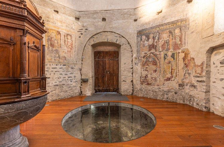 Mazzo traces its history back to Roman times. In the early Middle Ages it became the spiritual capital of an extensive parish, to which all gravitated to receive the sacrament of baptism. The church of Santa Maria [13] developed around the old pieve (rural church with baptistry) of Santo Stefano and is of enormous interest. It conserves the only clear traces of the initial Christianization of the valley: the octagonal Romanesque baptistry and the ancient baptismal pool (6th-7th century).