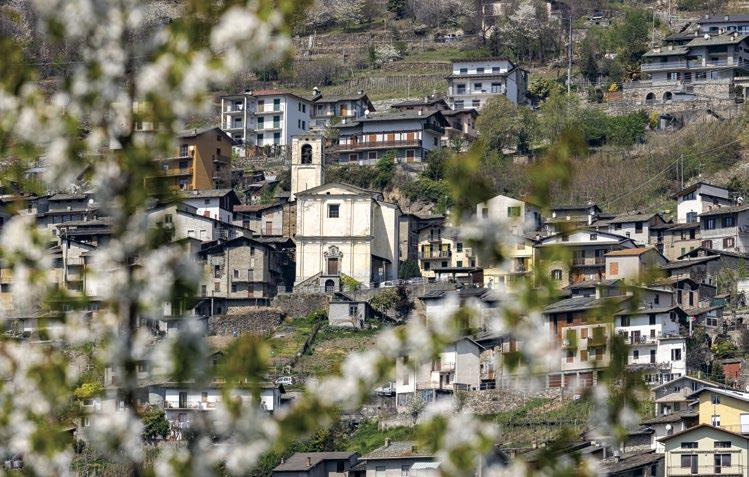 Lungo il tragitto meritano attenzione Torre Homodei e Palazzo Homodei, appartenuti alla famiglia più facoltosa del paese. Alla candida chiesetta della Madonna della Neve [16] si giunge percorrendo la Via Strencia, che per secoli ha collegato le quattro contrade sparse: “stretta” di nome e di fatto, delimitata com’è da alti muri. L’edificio può certamente dirsi spoglio, ma lo sguardo rimane catturato dalla preziosa ancona in legno dipinto e dorato, intagliata dal grande Giacomo Del Maino nell’ultimo decennio del Quattrocento. Sul fondovalle un attraversamento consente di raggiungere la pista ciclabile per Tirano. Tutto intorno, il paesaggio terrazzato racconta quanto sia stata importante l’economia del vino per la Valtellina e per la stessa Tirano, resa prospera dai commerci con la vicina Svizzera, agevolati dalla centralità geografica e dalla vicinanza al passo del Bernina.