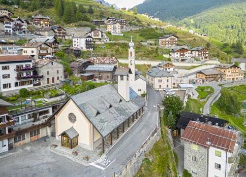 Take a final look at the stunning amphitheatre of peaks surrounding you before descending to Sondalo and the beautiful parish church of Santa Maria Maggiore [9]. The original church, documented in 1025, was much smaller. It looked out over a fortified burg. The slopes above it were much steeper and wilder than they are today after the construction of sanatoria for the treatment of tuberculosis. Rebuilt in the 17th century by Gaspare Aprile of Ticino, the church is distinguished by the portico that wraps around it, supported on massive walls. The most curious Marian effigy is the Madonna vestita, which was removed from the altar of the Rosary in the late 19th century by order of the bishop. Her rich wardrobe, composed of dresses and petticoats, has unfortunately been lost; the wooden statue and her processional canopy still survive.