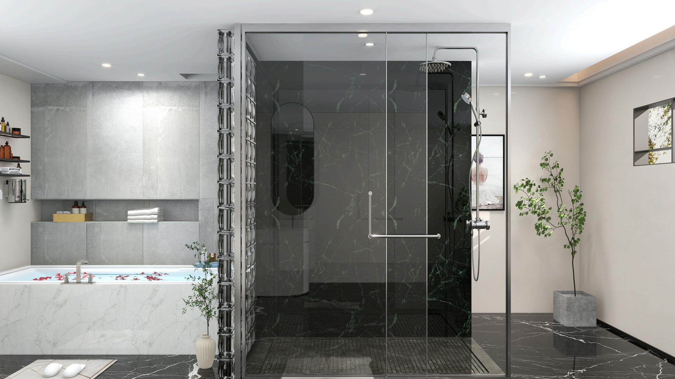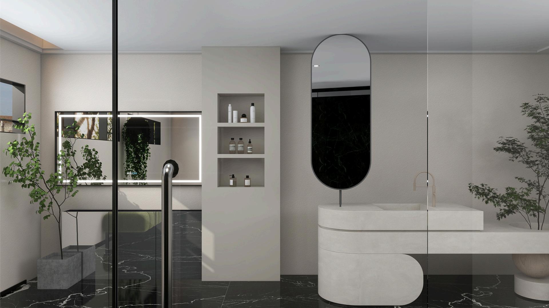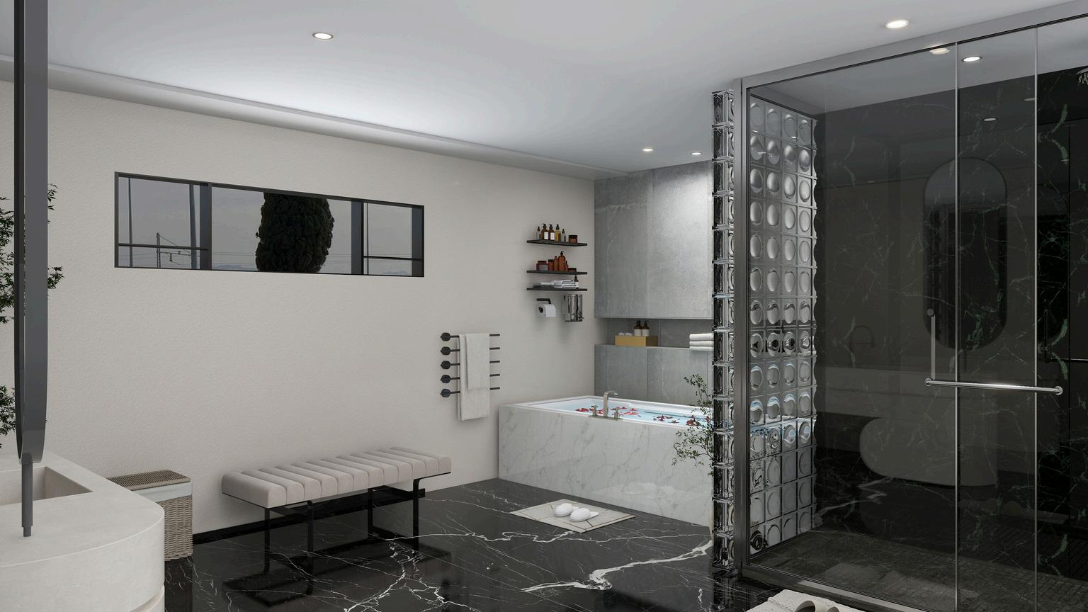 Spa-likeatmospherewithnaturalstone,wood,andsoftlighting.