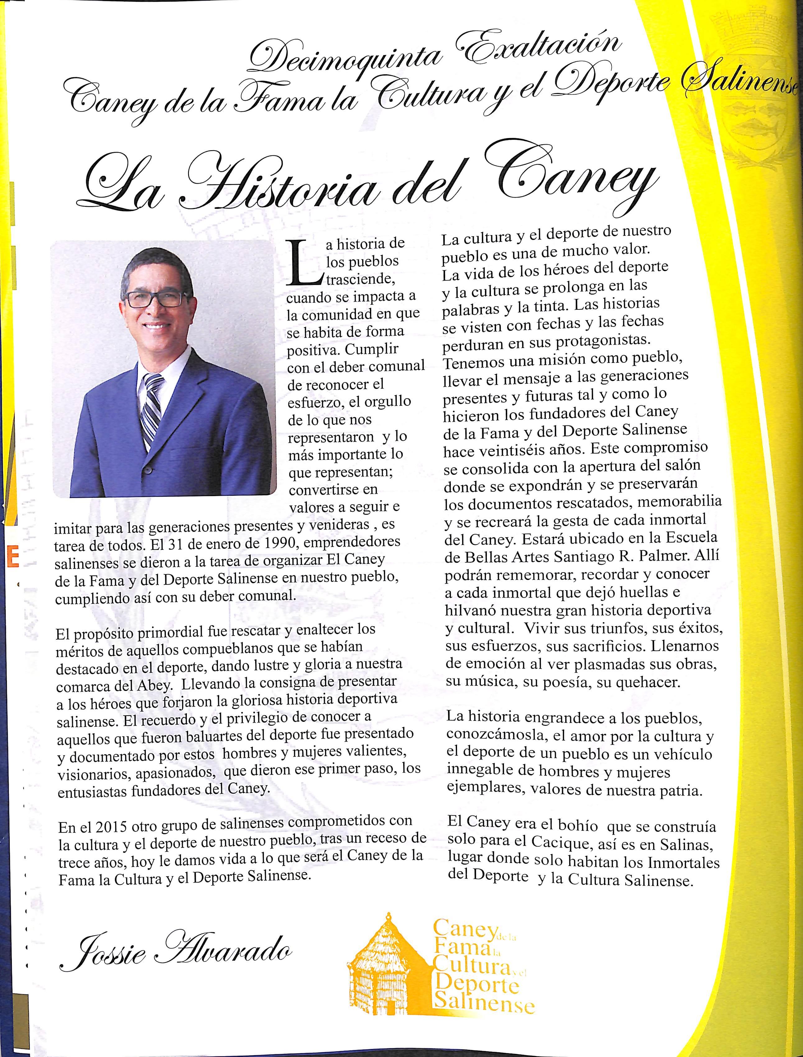 Publicación que recoge la programación de la 15a Ceremonia de Exaltación de El Caney de la Fama de la Cultura y el Deporte Salinense dedicada a los expresidentes de la entidad. Los 7 exaltados son: Rumildo Cruz Quiñones, Javier Soto Colón, Roberto Alomar Velázquez, Ruben Colón de Alba, Ricardo A. Ledée Colón, Santos Alomar Velázquez y Nelson E. Malavé Torres