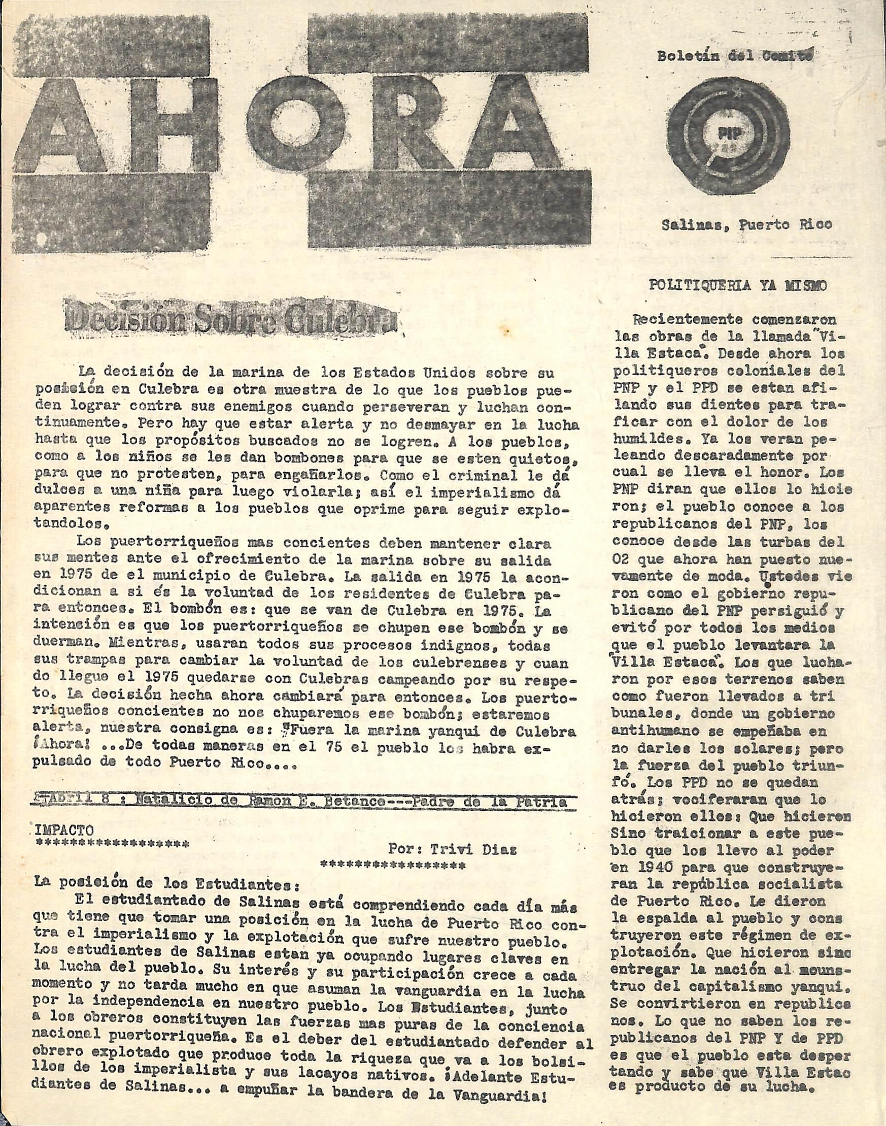 AHORA, cumplirá con la tarea suplemen ría de orientaciái, capacitación politic y responsabilidad ante el caos administ-r tivo que cunde en todas las esferas del sistema y sus respectivas extruturas pod das. AHORA es el vocero del Comité Munic pal del partido Xndepententista Puertorr queno en Salinas; AfDRA es el vehículo d comunicación de toda la membreaia milita te del PIP en Salinas, para dar a conoce sus actividades y trabajos realizados po el comité' municipal.