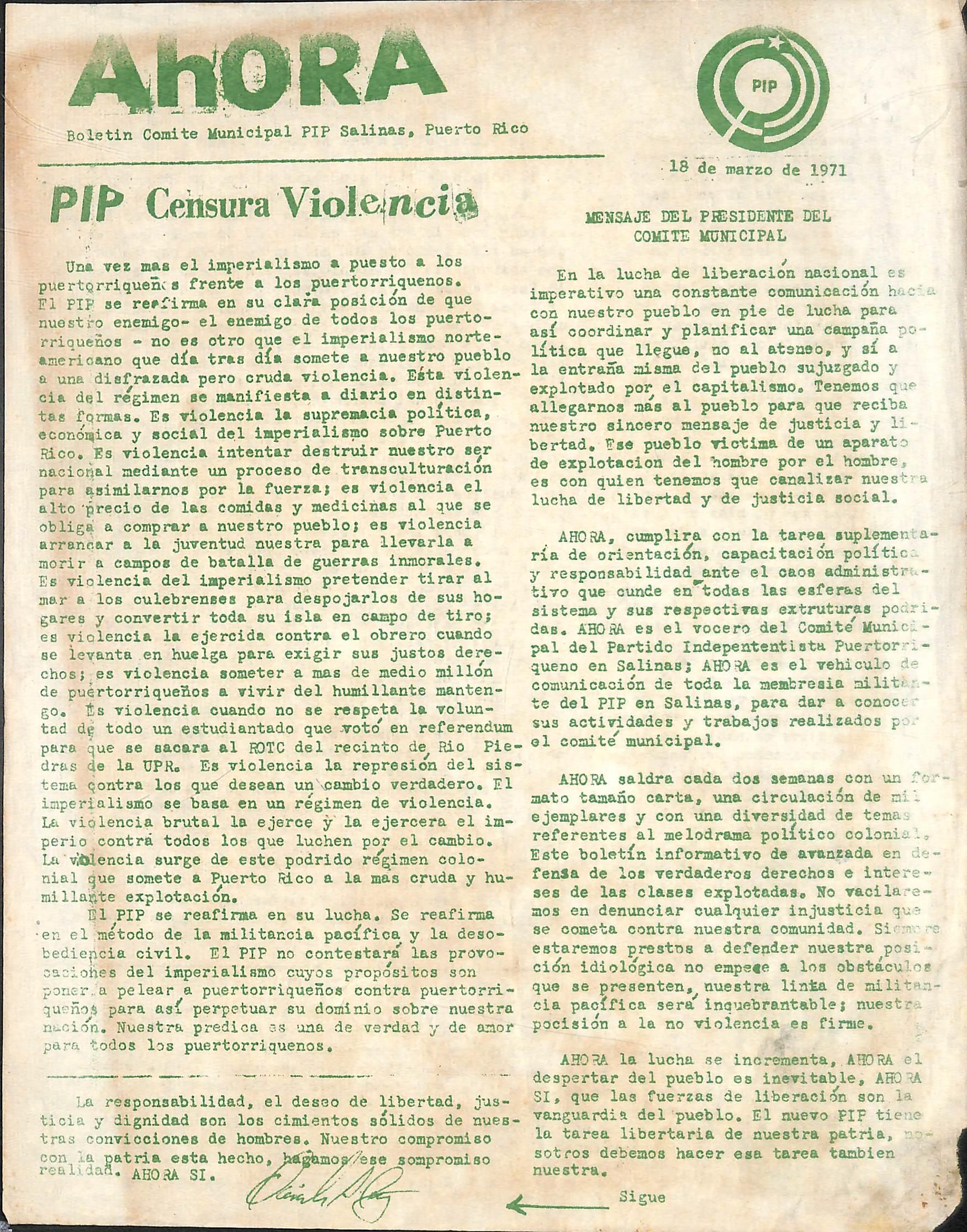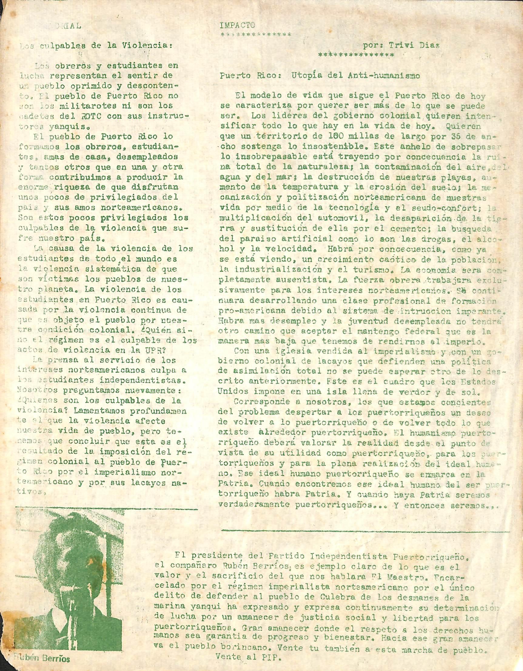 Una vez mas el imperialismo a puesto a los puertorriqueñas frente a los puertorriqueños# F1 PIP se rcarirma en su clara posición de que nuestro enemigo*» el enemigo de todos los puerto* rriaueños •» no es otro que el imperialismo norteaaerioano que día tras día somete a nuestro pueblo a une disfrazada pero cruda Tiolencia» Esta Triolencia del régimen se manifiesta a diario en distin tas formas. Es Tlolencia la supremacía política, económica y social del imperialismo sobre Puerto Rico. Es Tiolencia intentar destruir nuestro s^r nacional mediante un proceso de transculturacion para asimilarnos por la fuerza; es violencia el alto •precio de las comidas y medicinas al que se obliga a comprar a nuestro pueblo; es violencia arrancar a la juventud nuestra para llevarla a morir a campos de batalla de guerras inmorales. Es violencia del imperialismo pretender tirar al mar a los culebrenses para despojarlos de sus ho gares y convertir toda su isla en campo de tiro; es violencia la ejercida contra el obrero cuando se levanta en huelga para exigir sus justos dere chos; es violencia someter a mas de medio millón de puertorriqueños a vivir del humillante manten go. ís violencia cuando no se respeta la volun tad d^ todo im estudiantado que voto' en referendum para que se sacara al RDTC del recinto de^ Rio Pie dras de la UPR. Es violencia la represión del aistema qontra los que desean un\cambio verdadero. El imperialismo se basa en un régimen de violencia. La violencia brutal la ejerce y la ejercerá el im perio contrá todos los que luchen por el cambio. La "violencia surge de este podrido régimen colo nial que somete a Puerto lUco a la mas cruda y hu millante explotación.