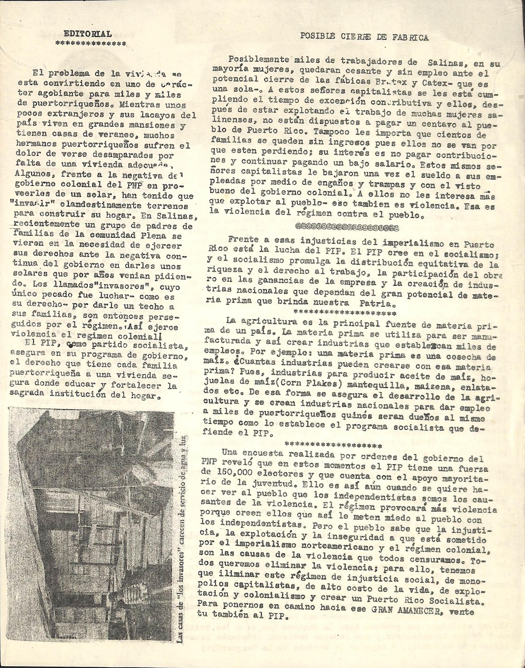 En la lucha de liberación nacional es imperativo una constante comunicación hac-a con nuestro pueblo en pie de lucha para así coordinar y planificar una campaña po lítica que llegue, no al ateneo, y sí a la entraña misma del pueblo sujuzgado y explotado por el capitalismo. Tenemos que allegarnos mas al pueblo para que reciba nuestro sincero mensaje de Justicia y li-bertad. Ese pueblo victima de un aparato de explotación del hombre por el hombre, es con quien tenemos que cenalitar nuestra lucha de libertad y de justicia social.
