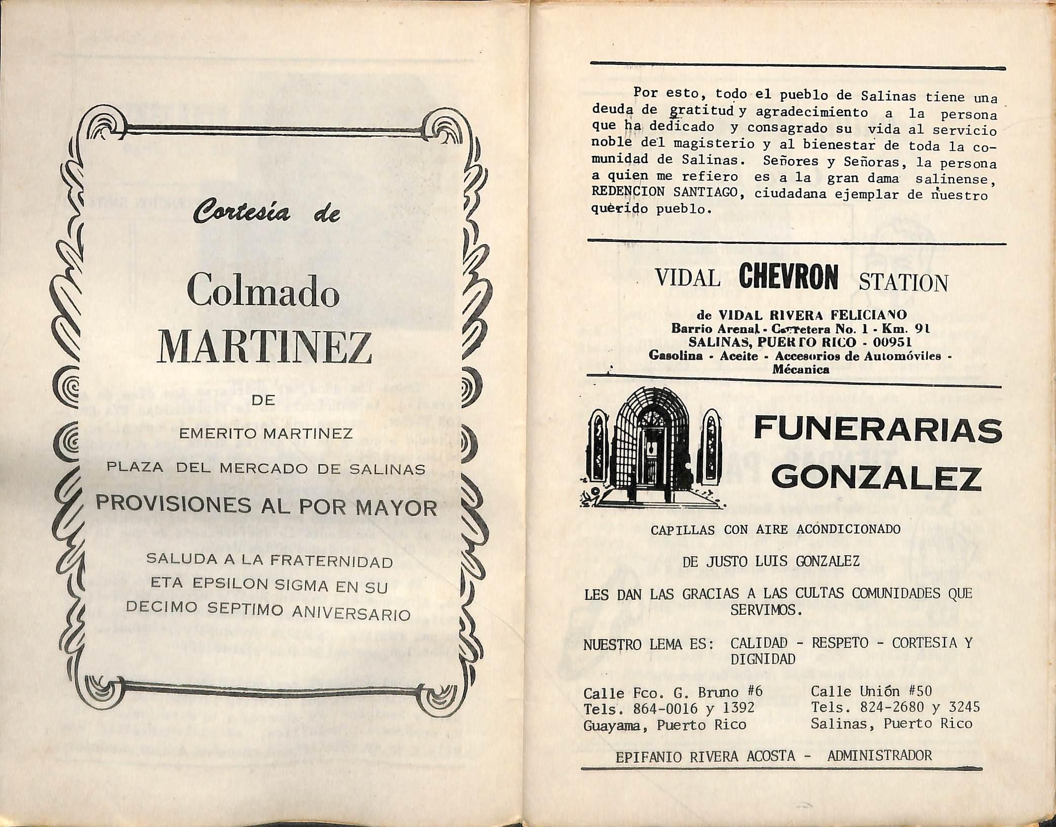 Todos los años, al acercarse los días de Ani versario, la matrícula de la Fraternidad ETA EPSILON SIGMA, escogé una persona en la comunidad salinense a quien se le dedica todas las Actividades de Aniversario. La selección de este año recae en una persona que por' mas de 30 años dedico su vida y esfuerzos en la tarea ejercida por Nuestro Señor Jesucristo, el magisterio. Comenzó el sacerdocio de maestra pensando en dar mas que en recibir, por que al dar se siente la satisfacción de que la vi da es Util y ayudamos a los demás.