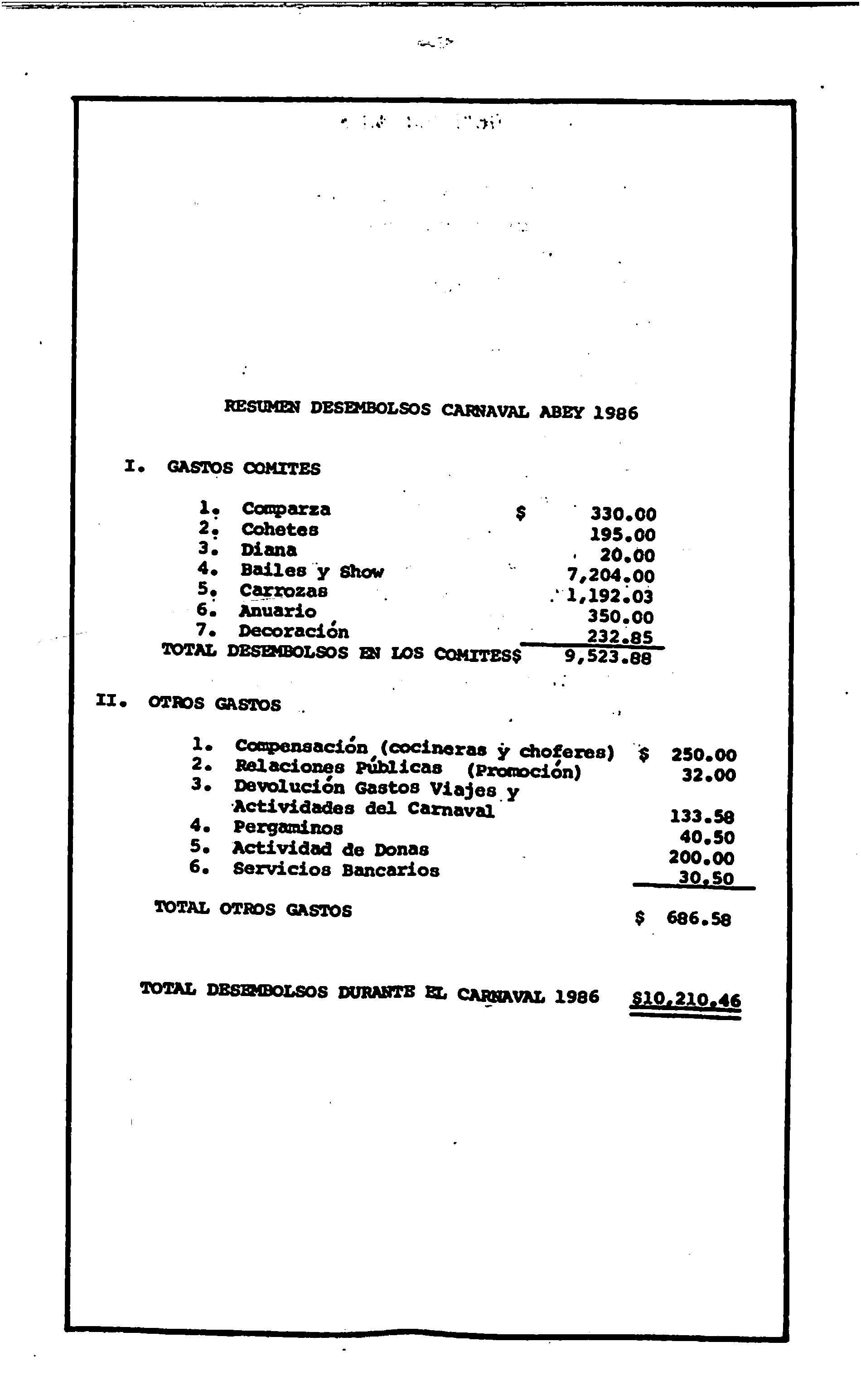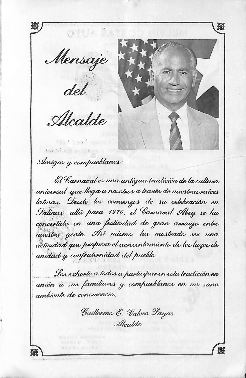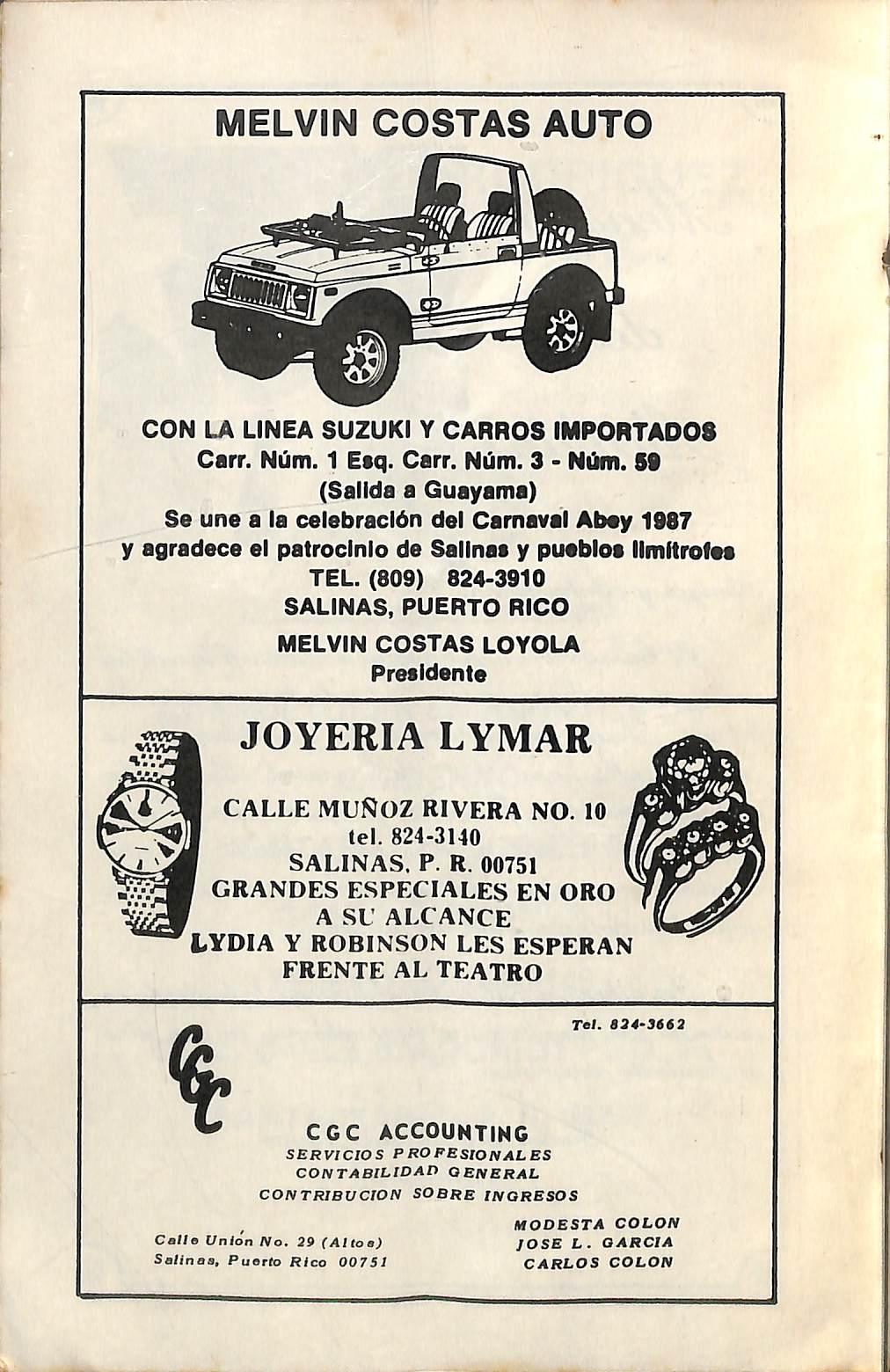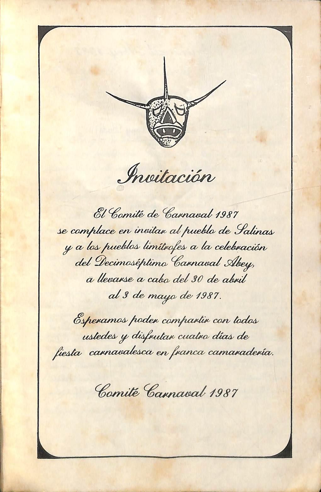 Programa del Carnaval Abey, edición de 1987 celebrado en Salinas durante la administración del alcalde Guillermo Valero Zayas. Presidió el comité de carnaval Angel Antonio Santiago Badé. Se incluye un informe contable sobre ingresos y gastos de carnaval.