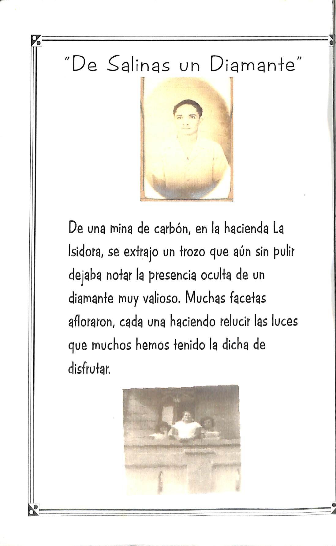 De una fnina de carbón, en la hacienda La Isidora, se extrajo un trozo que aún sin pulir dejaba notar la presencia oculta de un diamante muy valioso. Muchas facetas afloraron, cada una haciendo relucir las luces que muchos hemos tenido la dicha de disfrutar.