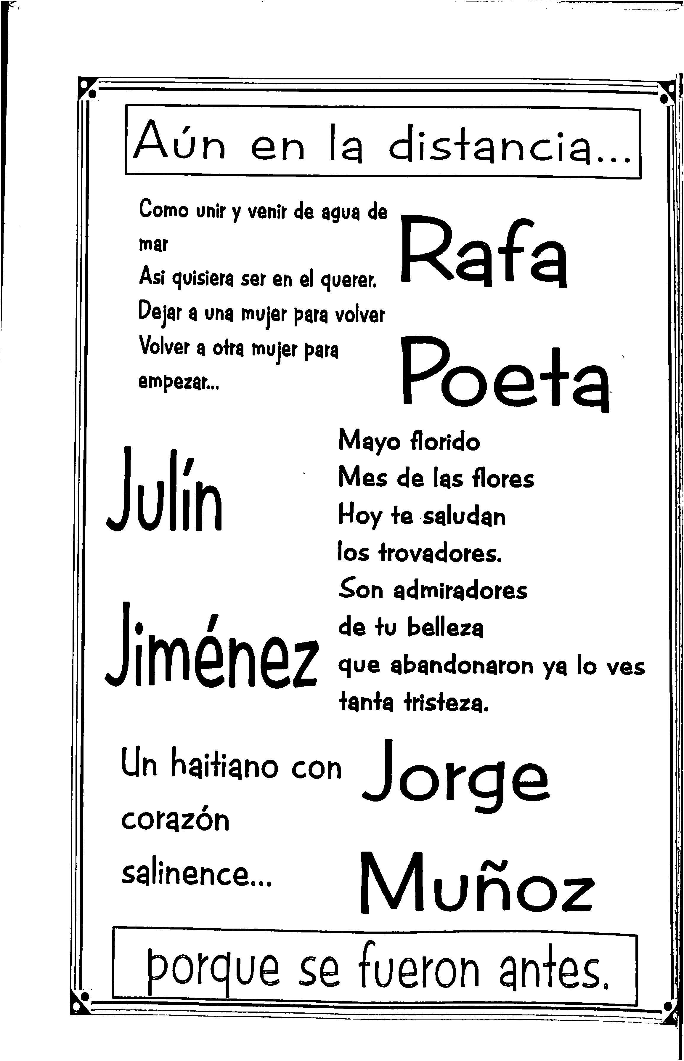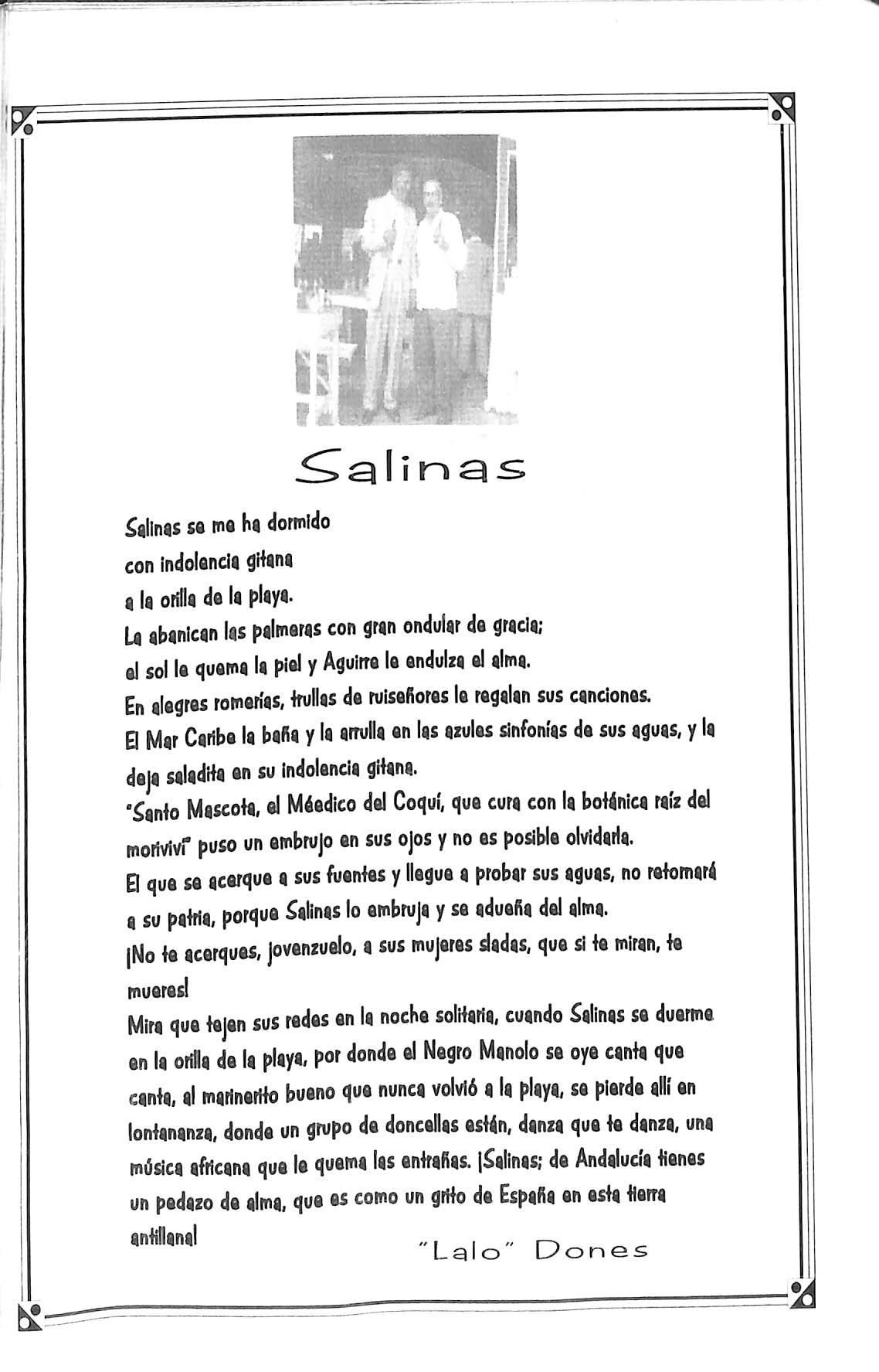 Mira que tejen sus redes en la noche soIrtaHa, cuando Salinas se duerme en la otffla de la playa, por donde el Negro Manolo se oye canta que canta, al matinerito bueno que nunca volvió a la playa, se pierde allí en lontananza, donde un grupo de doncellas estín, danza que te danza, una música afHcana que le quema las entrañas. iSallnas; de Andalua'a tienes un pedazo de alma, que es como un grito de España en esta tierra antillanal -i i - r-i Lalo Leones