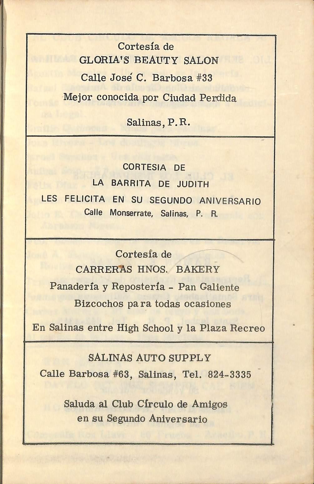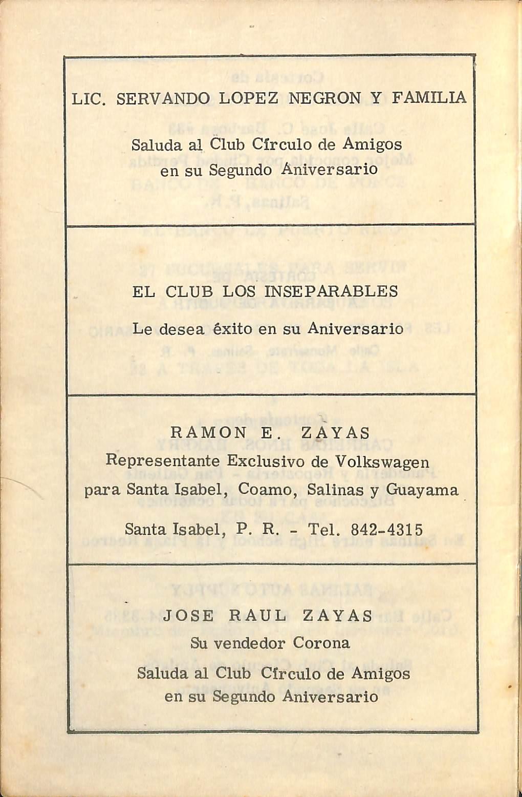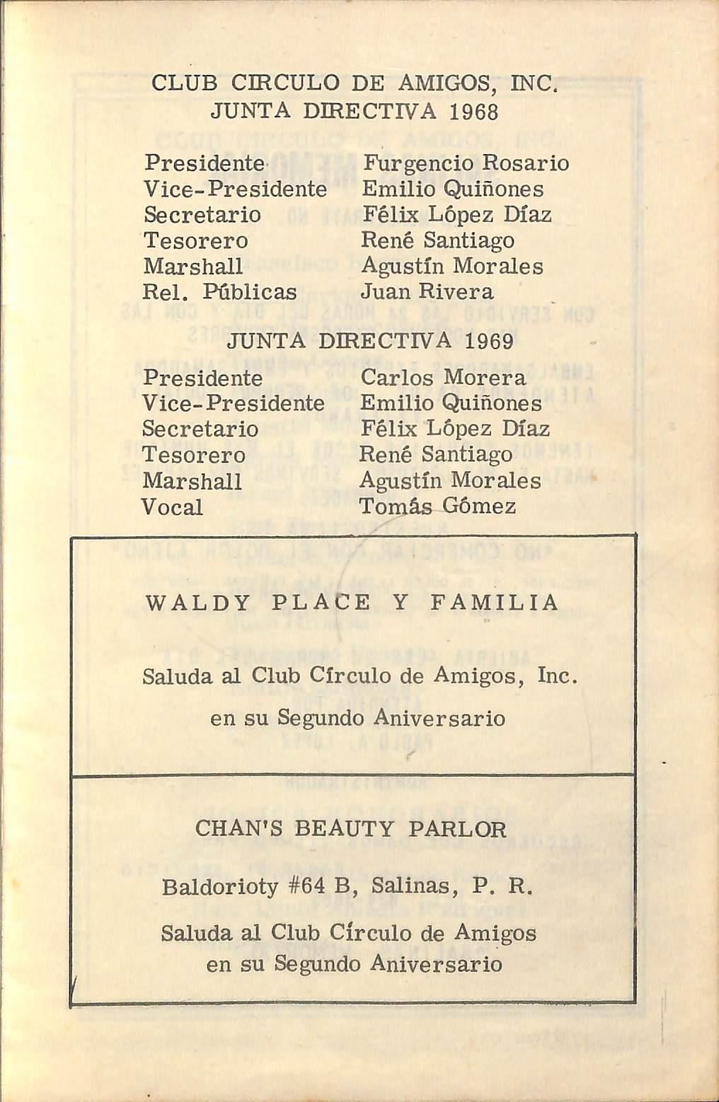 Folleto de celebración del segundo aniversario del Club Círculo de Amigos fundado en 1968 en Salinas Puerto Rico. Incluye mensaje del presidente Emilio Quiñones, dedicatoria al atleta olímpico salinense Julio Lleras, foto de la junta directiva para 1969 presidida por Carlos Morera, reconocimiento a los socios René Santiago y Agustín Morales y a William de Jesús, así como datos sobre el el Segundo Maratón La Monserrate por Juan Rivera