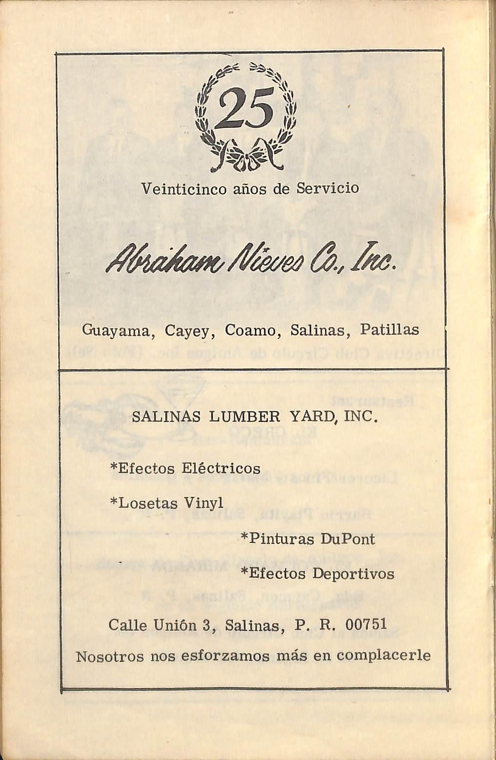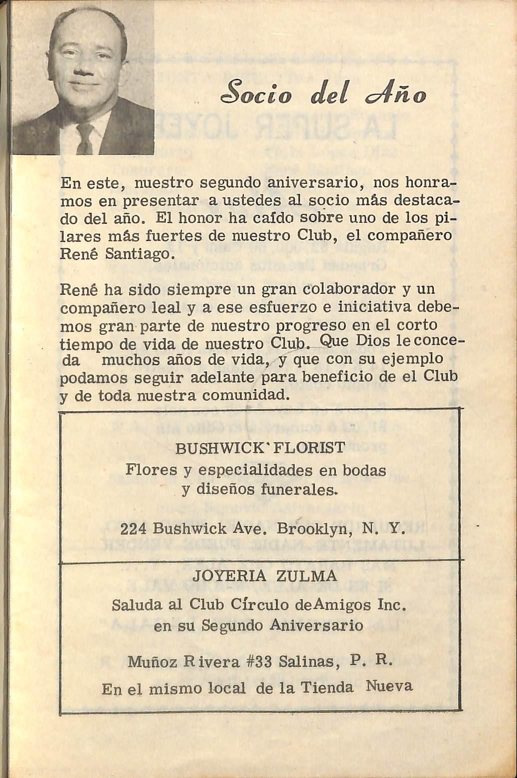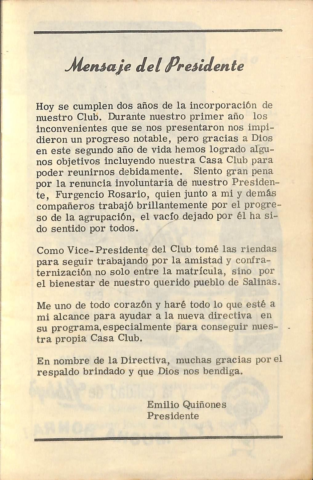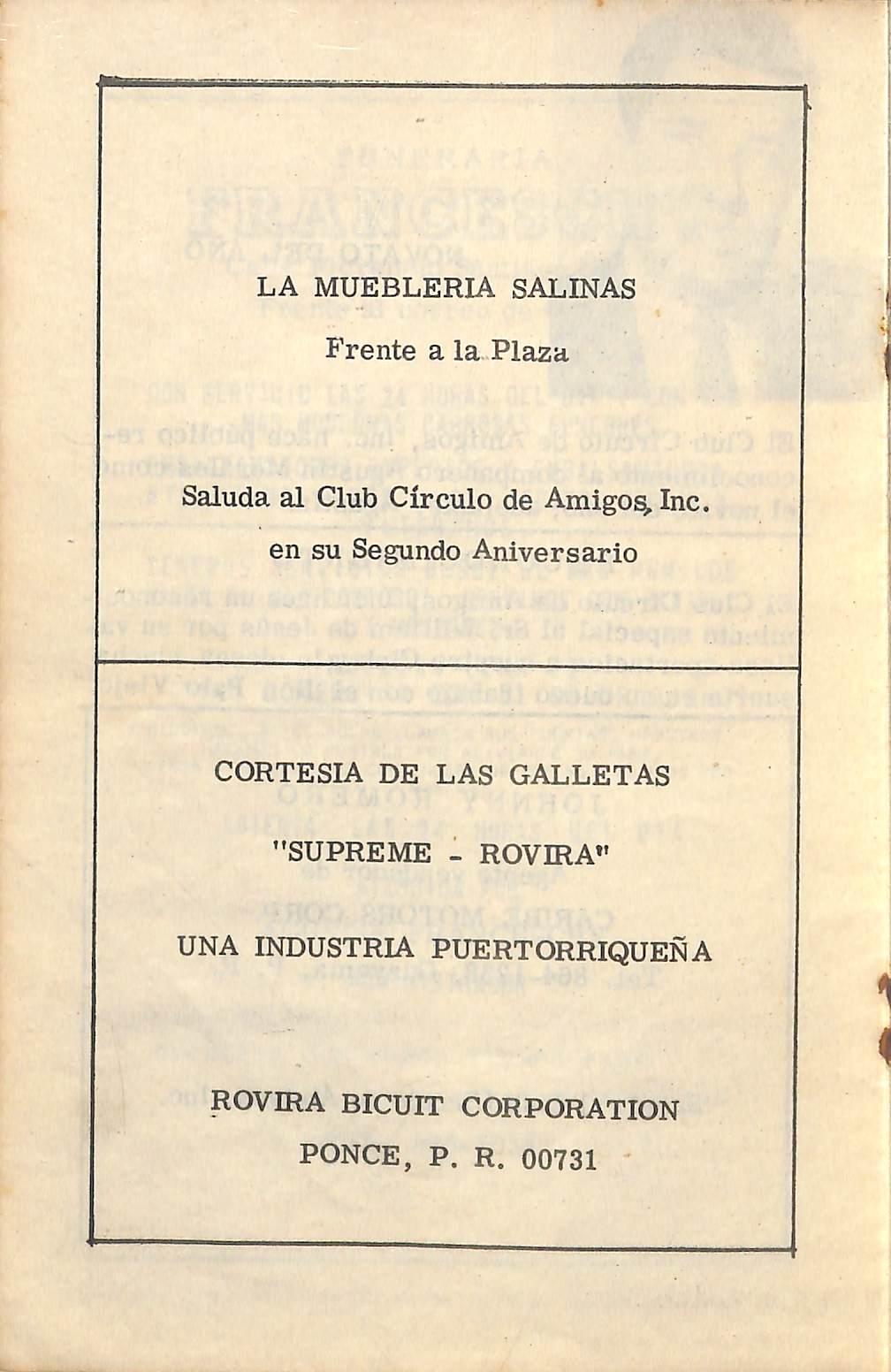 Folleto de celebración del segundo aniversario del Club Círculo de Amigos fundado en 1968 en Salinas Puerto Rico. Incluye mensaje del presidente Emilio Quiñones, dedicatoria al atleta olímpico salinense Julio Lleras, foto de la junta directiva para 1969 presidida por Carlos Morera, reconocimiento a los socios René Santiago y Agustín Morales y a William de Jesús, así como datos sobre el el Segundo Maratón La Monserrate por Juan Rivera