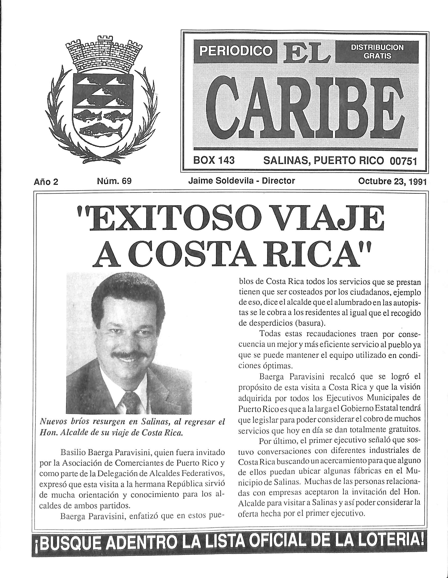 Baerga Paravisini recalcó que se logró el propósito de esta visita a Costa Rica y que la visión adquirida por todos los Ejecutivos Municipales de Puerto Rico es que a la larga el Gobierno Estatal tendrá que legislar pai'a poder considerar el cobro de muchos servicios que hoy en día se dan totalmente gratuitos. Por último,el primer ejecutivo señaló que sos tuvo conversaciones con diferentes industriales de Costa Rica buscando un acercamiento para que alguno de ellos puedan ubicar algunas fábricas en el Mu nicipio de Salinas. Muchas de las personas relaciona das con empresas aceptaron la invitación del Hon. Alcalde para visitar a Salinas y asípoder considerar la oferta hecha por el primer ejecutivo.