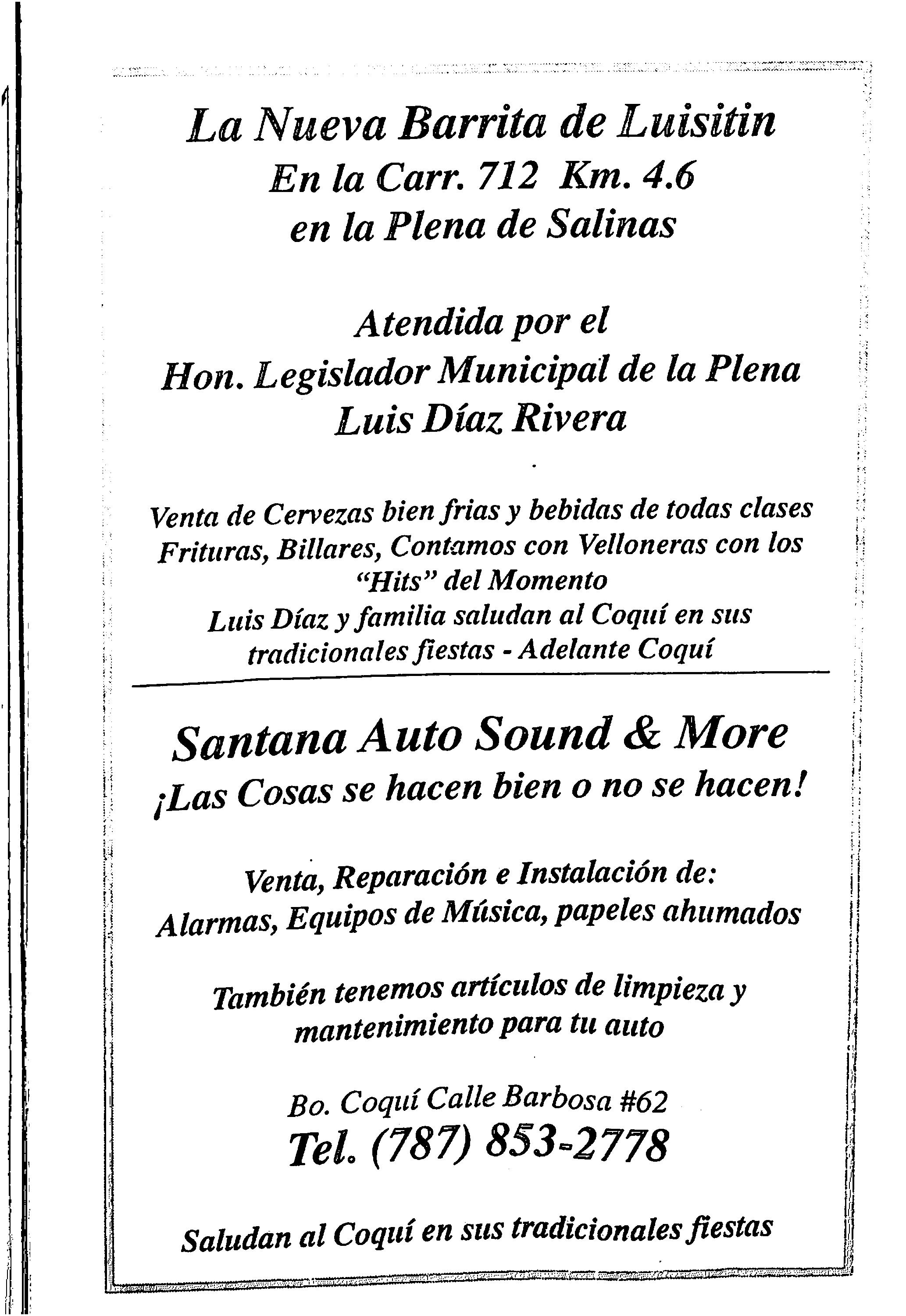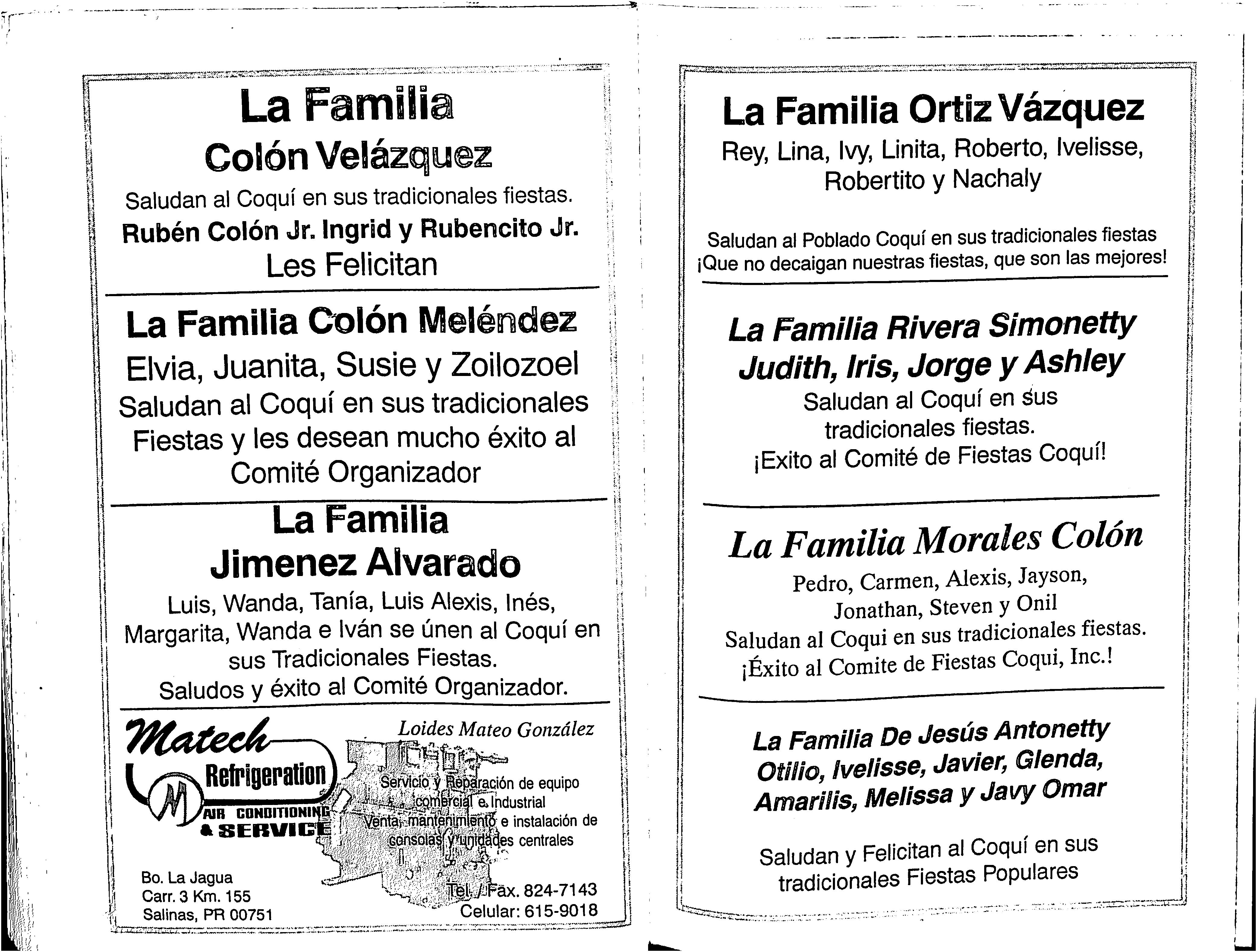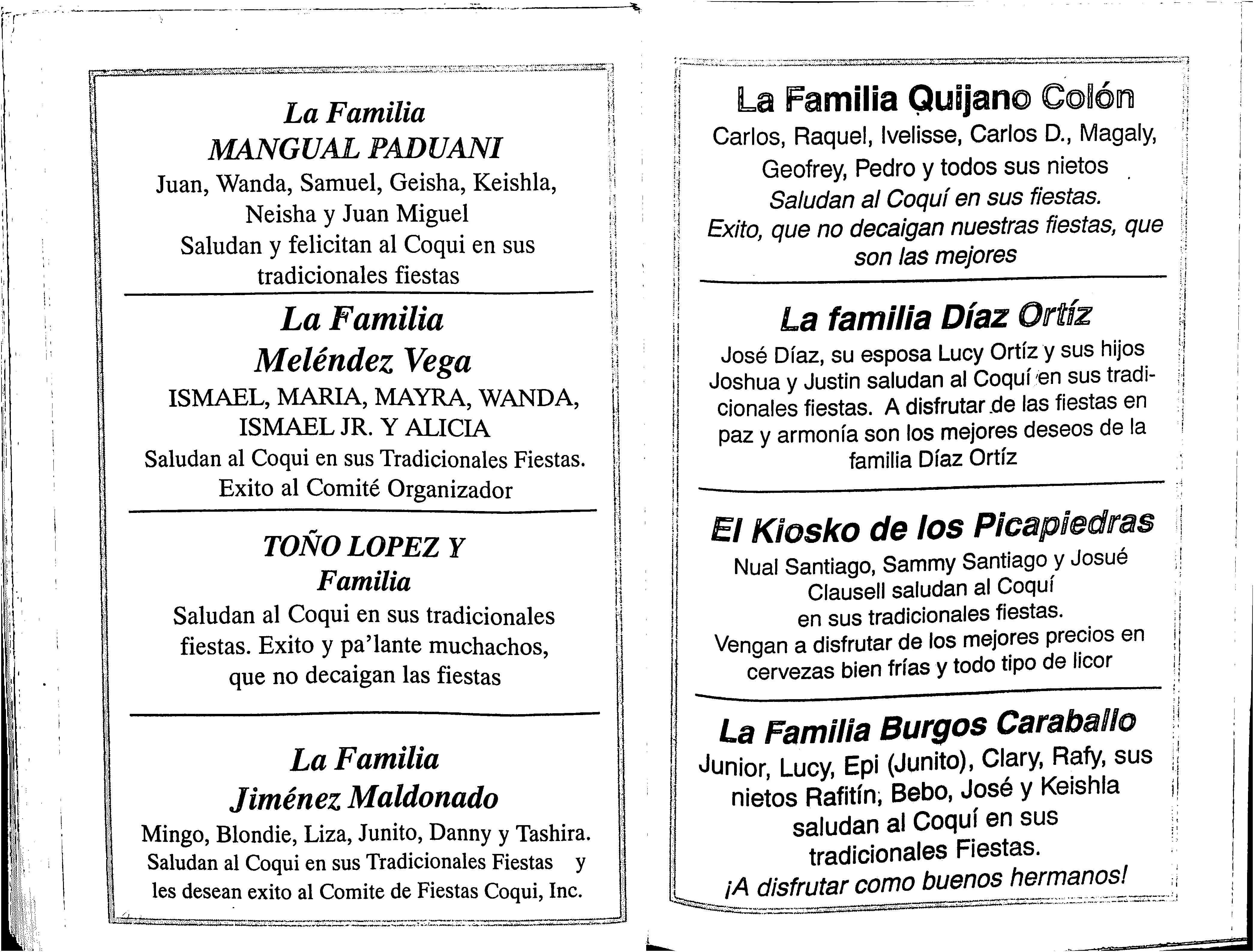 Yuyo, Esther, Javao, Jossie, Vilma, Tita, Edgar, Gul y Monchin. Saludan al Coquí en sus tradicionales fies tas y les desean mucho éxito al Comité de Fiestas Coquí Inc.