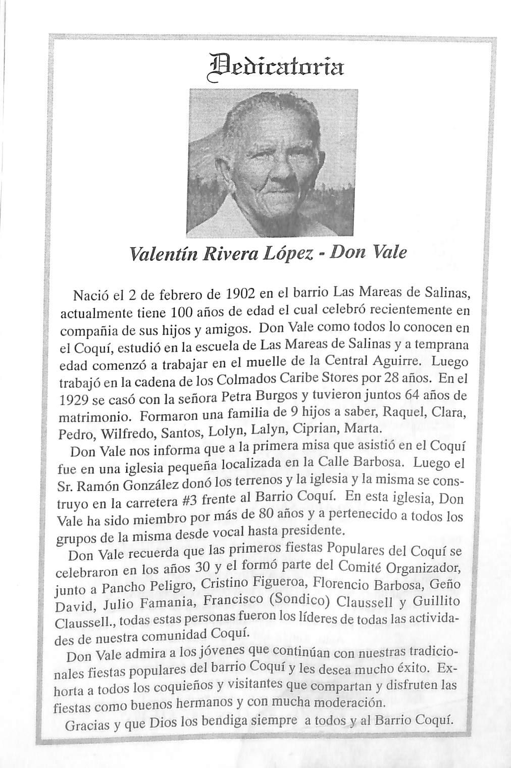 Esta dedicatoria debe servir de ejemplo a cada residente ya que en "Don Vale" encontramos un ser humano especial y ejemplar demostrando así que "Don Vale" ha contribuido grandemente en el mejoramien to de la calidad de vida del poblado Coquí.