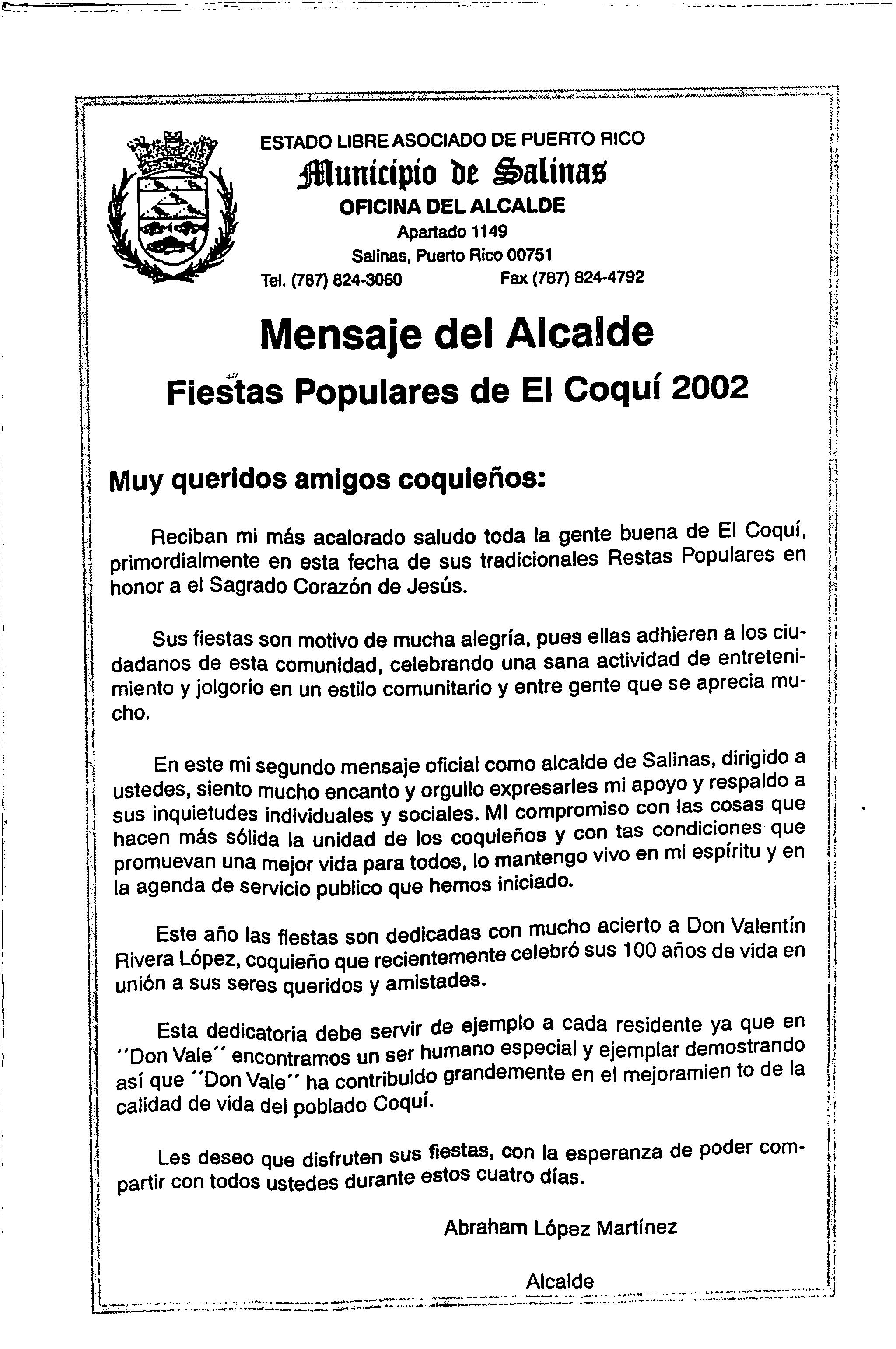 Don Vale admira a los jóvenes que continúan con nuestras tradicio nales fiestas populares del barrio Coquí y les desea mucho éxito. Ex horta a todos los coquieños y visitantes que compartan y disfruten las fiestas como buenos hermanos y con mucha moderación.