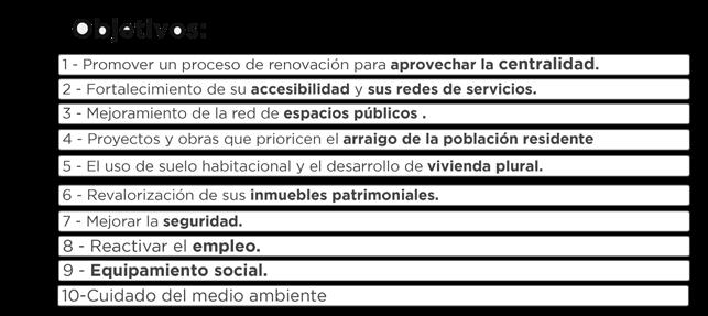 Intervenciones en el espacio público e inmuebles que fomenten el turismo, peatonalización de calles y la remodelación del salón hidalgo como proyecto detonante de la vida nocturna y la creación de hoteles temáticos.