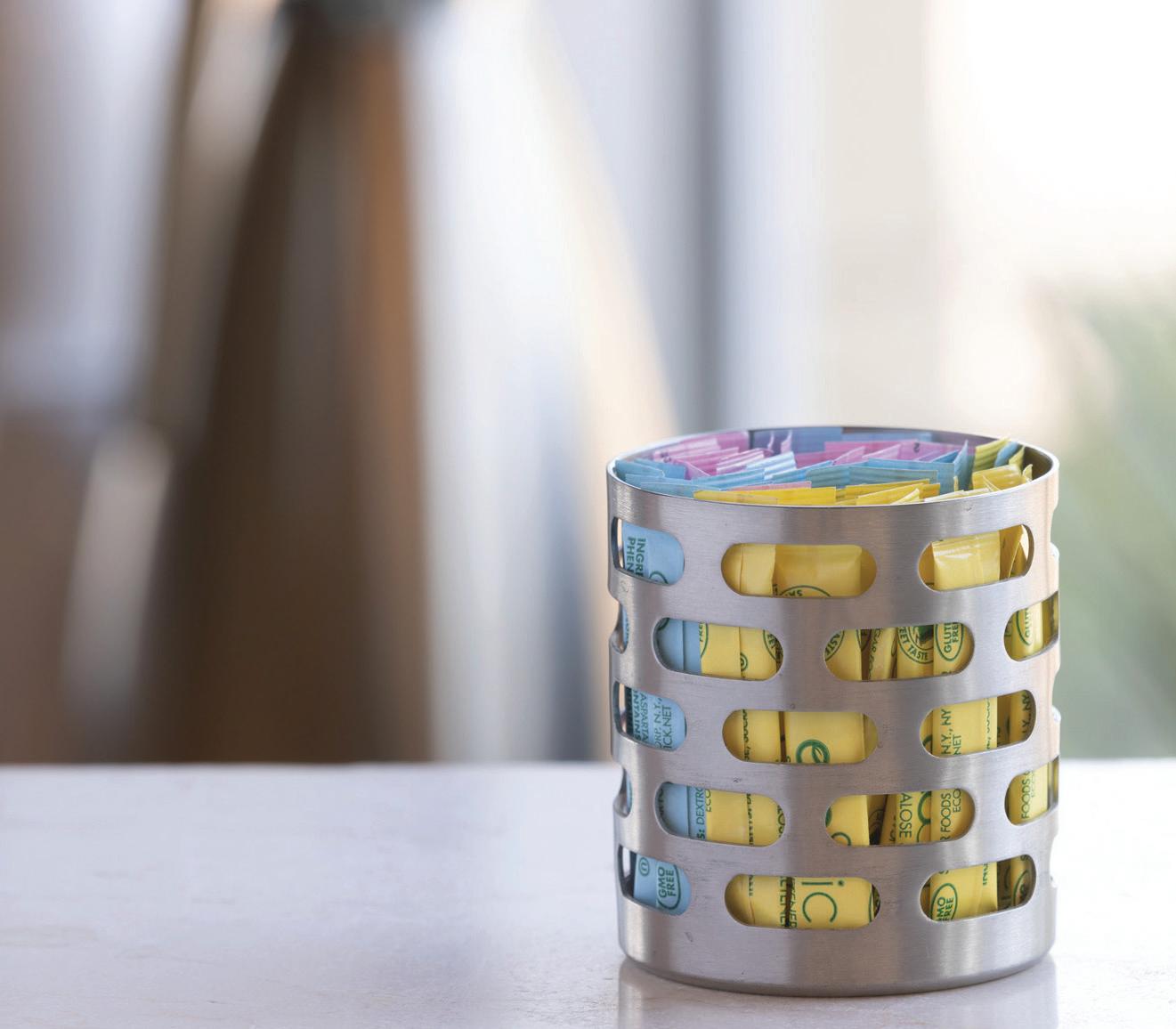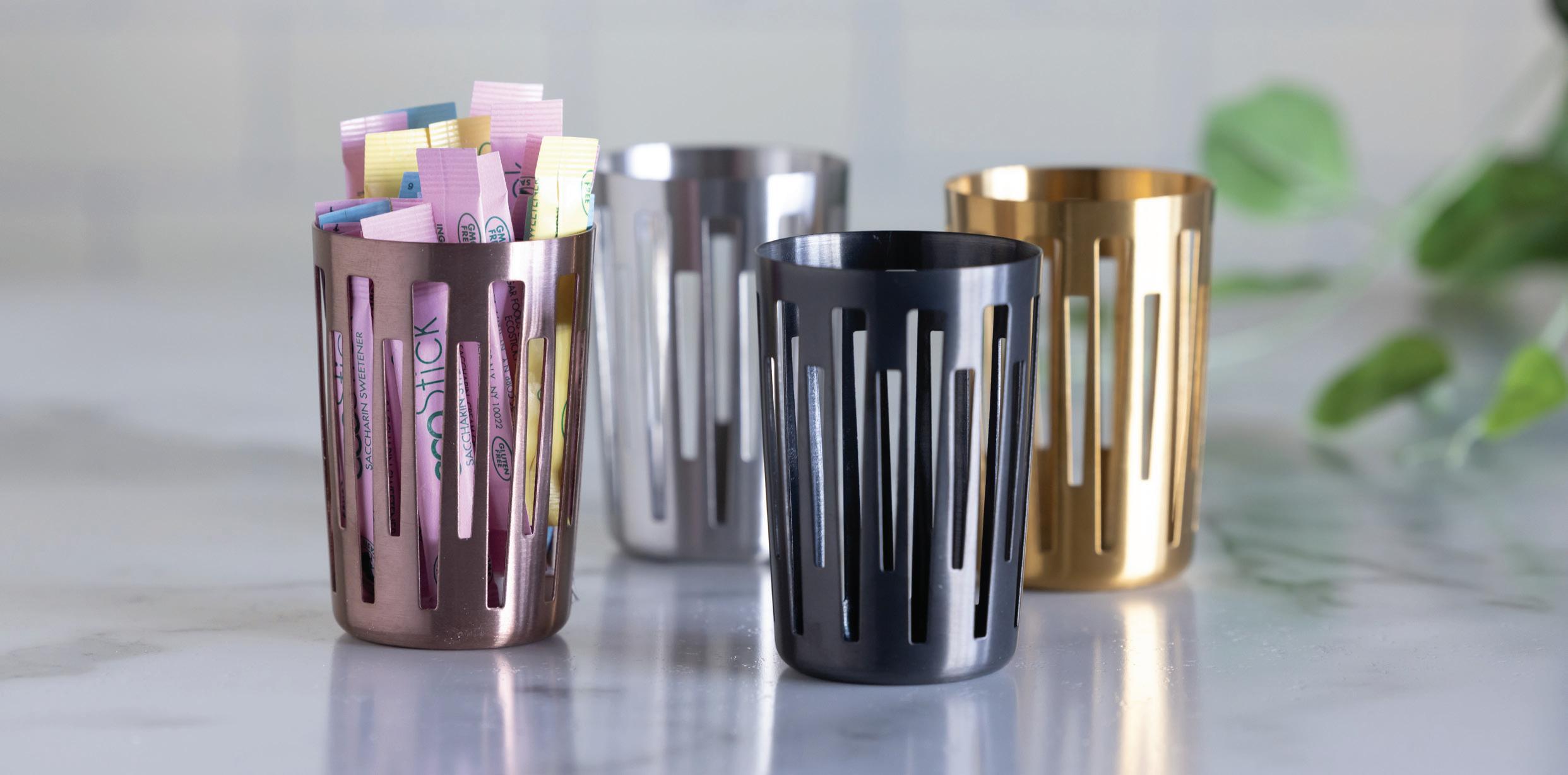 These compact baskets feature a bold sunburst design, perfect for organizing condiments, packets, or stir sticks.