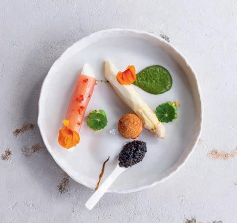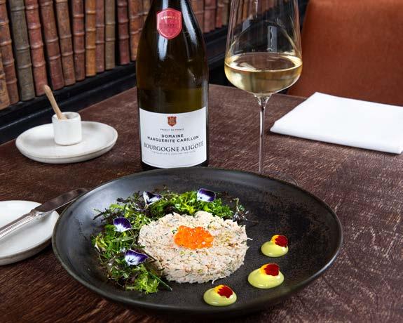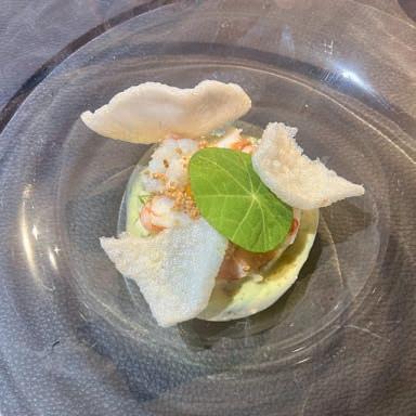 Entrée : Tartare de langoustine et d’huîtres en fraîcheur, voile d‘effervescent Chardonnay Meerdael, crème végétale Flores et accents iodés.