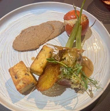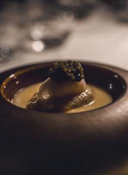 Plat : Coucou de Malines en deux textures, sublimé aux escargots petits gris de Namur, billes de carottes glacées avec une polenta au parmesan et émulsion végétale à l’ail des ours.