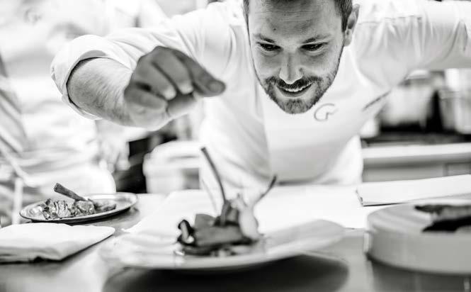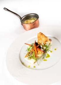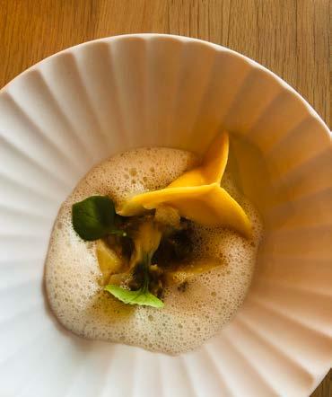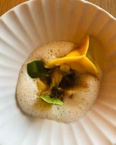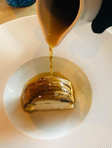 Martin Simonart, de jonge chef van Château du Mylord in Elzele, stelt, in samenwerking met zijn maître d’hôtel, ook een origineel recept voor om bij een visgerecht te serveren. ‘We hebben gekozen voor een gedurfde pairing: een infusie van schaaldieren en gentiaan die een geroosterde zeebaars, vooraf gemarineerd in achiote (een Mexicaanse kruidenmix met warme en rokerige tonen) nog beter tot zijn recht laat komen.’