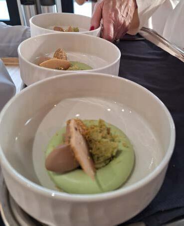De consommé wordt zo een volwaardige soep: helder, precies en bijna grafisch in zijn transparantie.