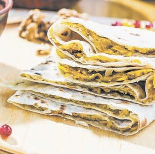 6 Dividir la masa en 10 bolas. Extender una fina capa ovalada de cada porción. Poner el relleno en el centro de la capa superior y cubrir la mitad inferior. Pegar el pan plano alrededor de los bordes y recortarlo uniformemente con una rueda de corte.