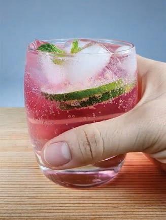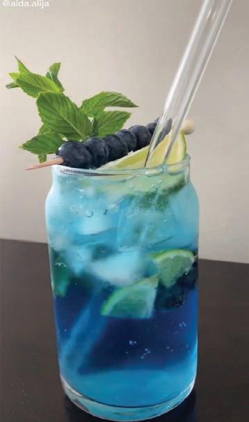 1 Se colocan 10 blueberries, 4 trozos de limón y hojas de yerbabuena en el vaso y se aplastan.