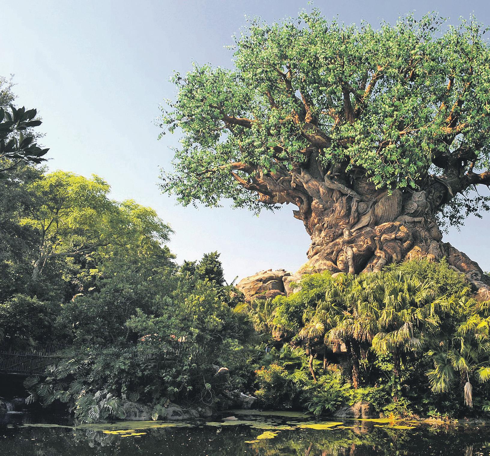 El árbol de la Vida. Con 145 pies de altura, el ícono del Parque Animal Kingdom parece ser real, pero fue hecho por un equipo internacional de artesanos que tallaron en su estructura más de 300 animales. / MWN