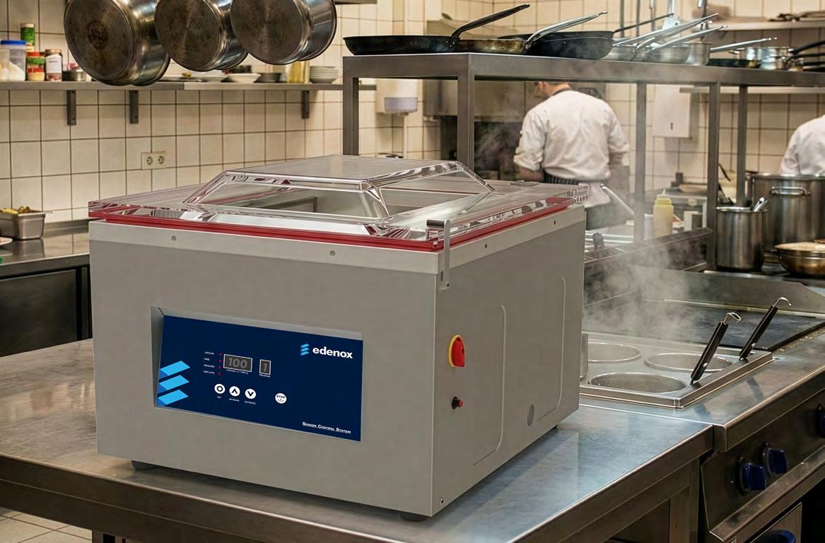 • Panel de control exclusivo Edenox Sensor Control, diseñado según los estándares europeos de ergonomía y operación. Vacío profesional 100 %: capaz de alcanzar el nivel de vacío óptimo para productos sólidos, con control por sensor.