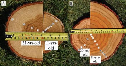 Os discos da direita de cada imagem (A e B) comprovam que o crescimento das árvores é mais rápido quando plantadas em florestas com maior diversidade.