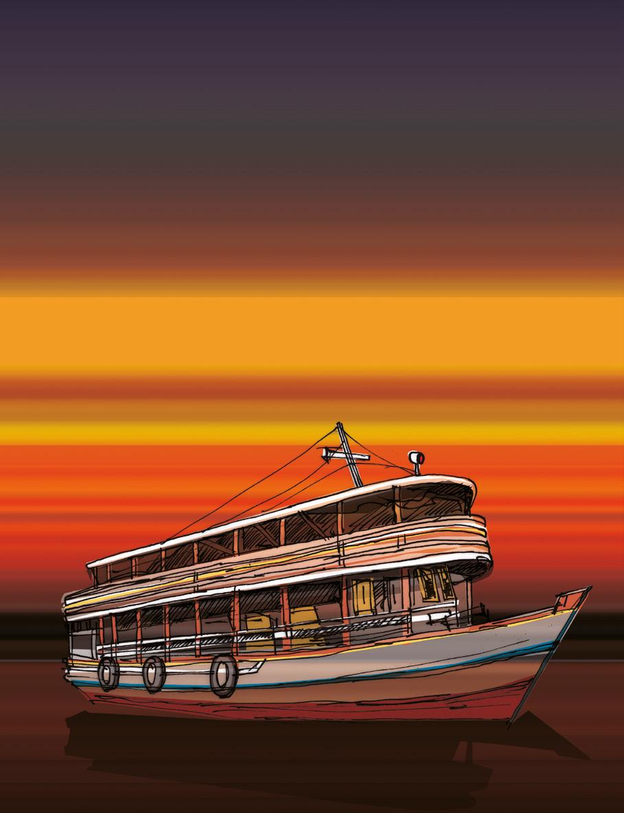 Quatro horas. O piloto avista Belém. As luzes pálidas bruxuleavam qual velas distantes. Todos viram a carreira de ratos se jogando na água, as baratas seguindo. Um cidadão, Titica, sacou o celular e fez a tal foto famosa, flasheada, dos bichos correndo pra água! Foi a única mensagem a chegar a Belém. Depois, silêncio. Pros de Belém que esperavam o primeira-hora e, até divisaram o vulto da balsa, essa foi a última imagem do Comandante Nelson, o nome do banheirão. Pra desgosto da mulher do senador que era dono dos donos de barco, isto era uma desgraceira; afinal, deveriam mostrar as maravilhas do Pará: praias, misses, búfalos, pastagem verde, gado gordo, procissão; mas, ratos! Valha-me-Deus! De outras partes de Belém, também se avistou o barco. Foi o Maninho-do-Amendoim, o Mendoim, quem o reconheceu. E, logo a nuvem cobriu o barco e Mendoim foi cuidar da vida, ensacar os amendoins-de-cada-dia em papelotes cônicos, pintar papelinhos com mensagens alvissareiras. No depoimento à televisão, que tal-qualmente correu o mundo, afirmou, peremptoriamente: “o bólido vinha bubuiando lá pelas tantas sumiu, sim, sinhô!” Tava era contente. “Mina de bom!”