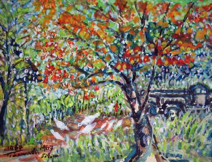 passamos por momentos difíceis juntos temos uma vida tranquila em Presidente Prudente. Sessenta e cinco anos se passaram em um piscar de olhos, sem fortuna, sem arrependimentos, abençoado com bons amigos! Deixei a agricultura, em que passei quarenta anos apaixonado pelas yamayama; há vinte e cinco anos pinto com as crianças do Brasil e sou grato por tudo isso. Cultivei minhas terras até 1970, só as deixei por uma situação única, foi duro ter de deixá-las, no entanto se não as tivesse deixado não teria a vida que tenho agora. Quando as deixei, senti como se estivesse me faltando um pedaço. Fiquei menos de um ano sem trabalhar, fui convidado pelo Bunkyo para ensinar a língua japonesa. Dei aulas por dez anos, só as deixei quando pediram para um jovem professor me substituir. Há vinte e cinco anos pinto com as crianças, seus desenhos me trazem ânimo e continuarei com elas até quando minha saúde me permitir. Muitos dos meus amigos do Japão morreram, mas seus corações ainda vivem dentro do meu coração. Sou grato aos meus amigos. Durante um longo tempo, trabalhei com o algodão, mas não guardei dinheiro, eu não tenho conexão com ele. Não me arrependo de nada nestes sessenta e cinco anos, eu estou vivo, minha vida ainda está em chamas como o Flamboyant e isso parece um sonho! (takeo sawada para o diÁrio Nippak, 1999, acervo ts, traduÇÃo livre carmo malacrida).