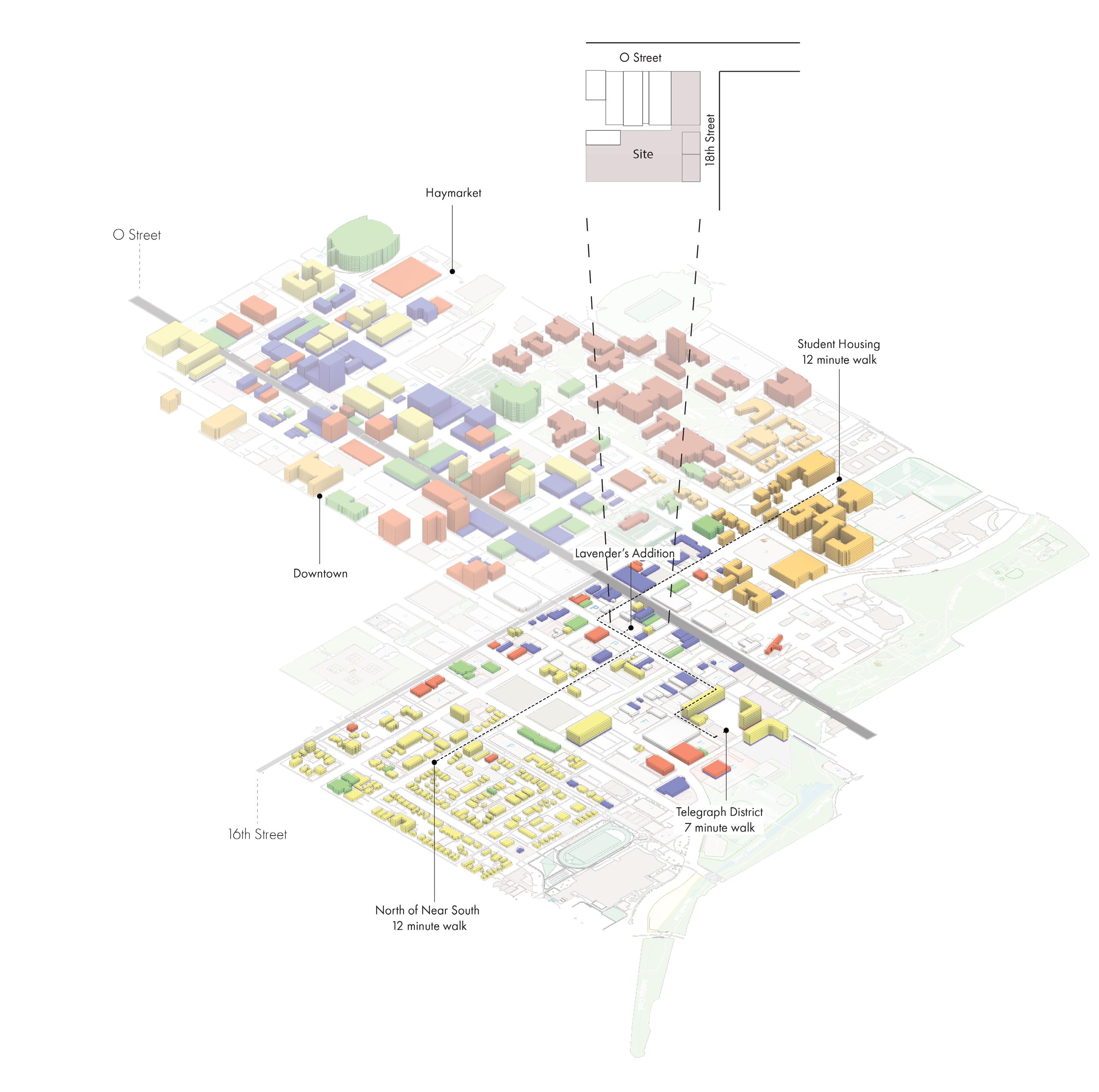My Home in the Sky is part of a redevelopment plan for the city of Lincoln NE that responds to sociatel contexts, such as issues surrounding food scarcity, privacy concerns in multi-generational housing, affordability, and ownership. Throughout the design process sketching, model making, and watercolor was used to both represent and ideate.