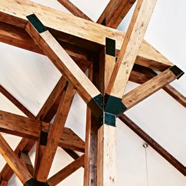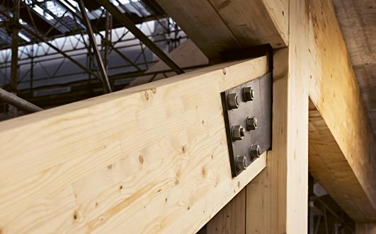 Övre bild: En stor del av träskelettet är synligt i byggnaden. Infästningarna mellan pelare och balk består av inslitsade smideplåtar.