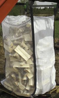 Pohja suljettu, nostolenkit ylhäällä. Säkin sivut hengittävää materiaalia. Ei sisällä kuvassa olevia polttopuita.