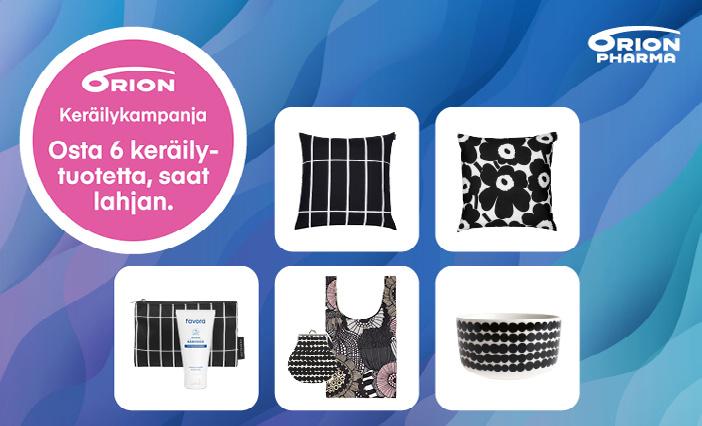 Suosittu Orionin keräilykampanja on taas täällä! Saat tuotelahjan kuudella keräilyleimalla tai -koodilla. Keräilytuote on Orionin normaalihinnaltaan vähintään 9 euron hintainen itsehoitotuote (kampanja ei koske lääkkeitä, sv-korvattavina ostettavia perusvoiteita ja eläintuotteita). Enintään 3 tuotelahjaa/talous. Keräilyaika 2.4.–30.6.2024.