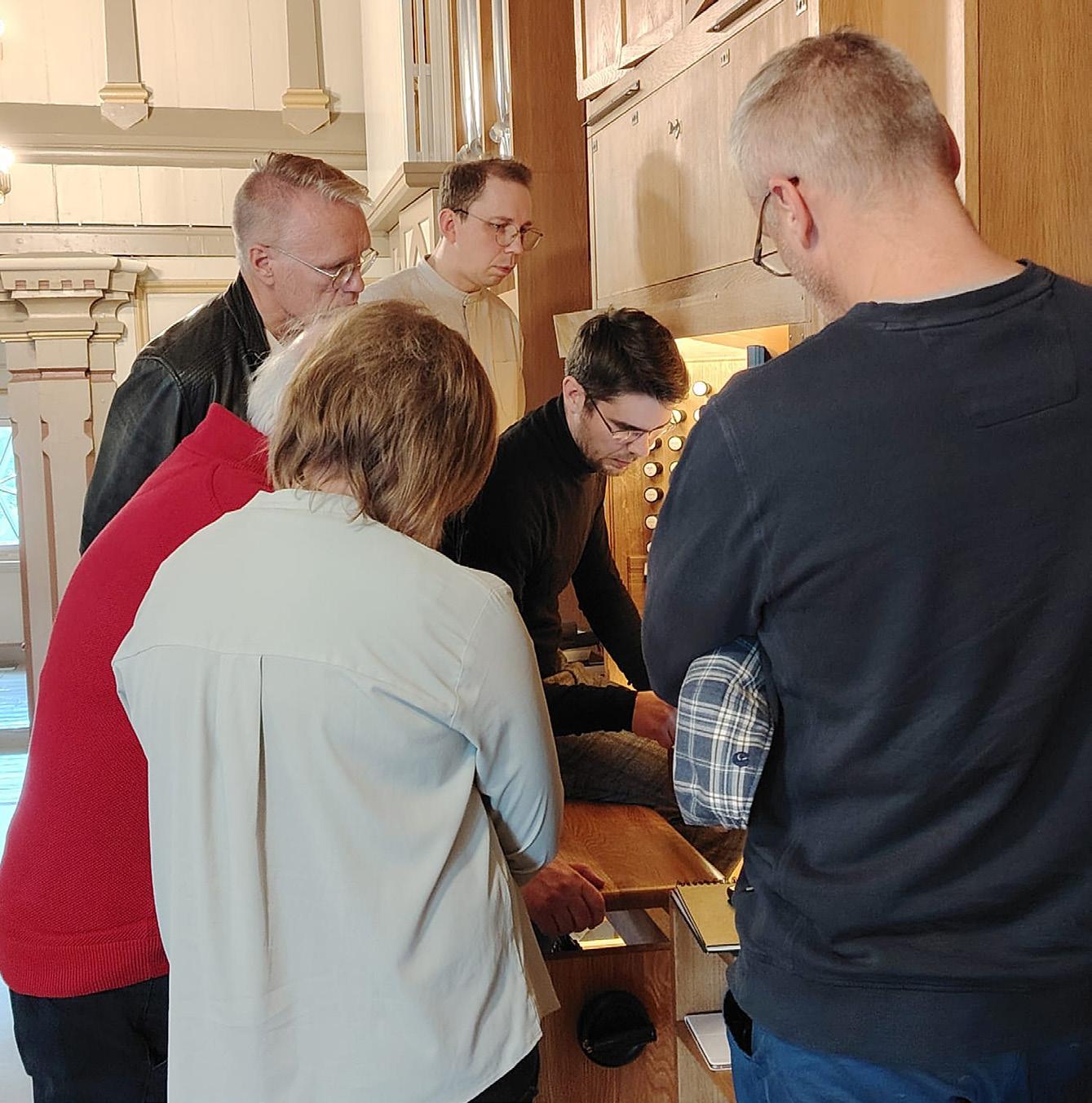 Oulaisten urkutoimikunta tutustumassa Kajaanin kirkossa urkujen tekniikkaan. Esittelijänä kanttori Olli Kinnunen.