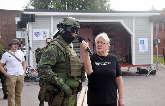 Tuula Aitto-oja haastatteli sotilaan taisteluvarustuksen ylleen laittanutta Jyrki Mänttäriä. Kuva: Aleksi Olli