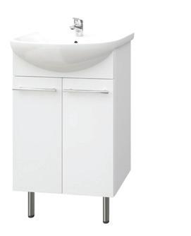Kiiltävän valkoinen allaskaappi posliinialtaalla. Kaapin runko on lastulevyä ja ovet MDF:ää. Kaapin PUR-liimatut reunalistat kestävät paremmin kosteutta. Pehmeästi sulkeutuvat saranat. Alaosan leveys 51 cm, syvyys 43 cm ja korkeus 67 cm.