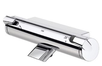 Termostaattinen Oras Optima -suihkuhana, jossa juoksuputki ja Easy Grip -kahvat. Kahvassa helppokäyttöinen vaihdin ja lämmönsäädin. EcoFlow-virtaamasäädin. Hanassa roskasiivilät ja yksisuuntaventtiilit.