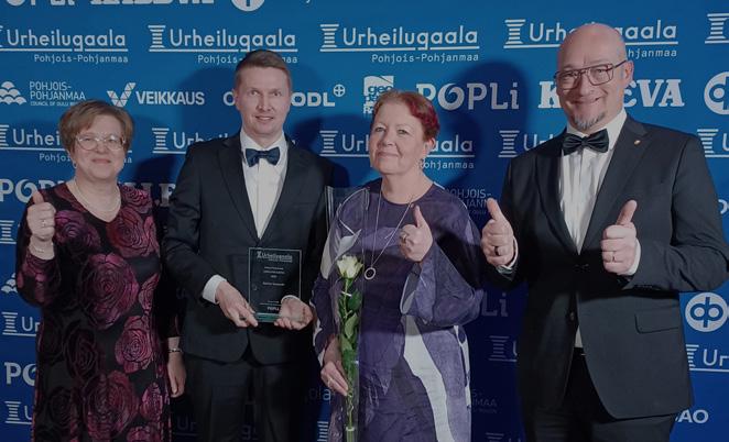 Raahen kaupungin palkintoa vastaanottamassa vasemmalta kaupunginhallituksen puheenjohtaja Sari Pekkala, liikuntapalvelupäällikkö Toni Ojala, kaupunginjohtaja Leena Mikkola-Riekkinen ja kaupunginvaltuuston puheenjohtaja Pekka Poukkula.