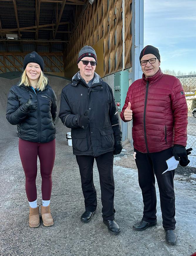 Vapaaehtoiset Venla Linnakivi, Mauri Myllykangas ja Aimo Vanha valmiina hiekoitushiekan jakoon. Kuva: Päivi Rantaeskola