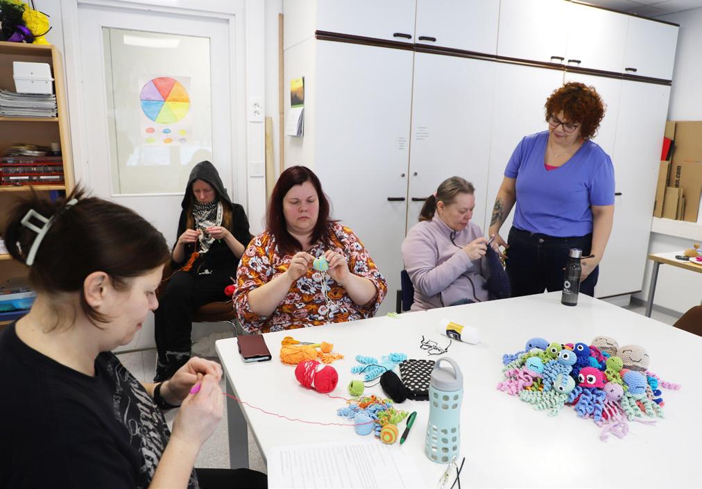 Työvalmentaja Suvi Hakala seuraa, kun työpajan kädentaitoryhmän jäsenet virkkaavat turvalonkeroita pienten vauvojen käyttöön.