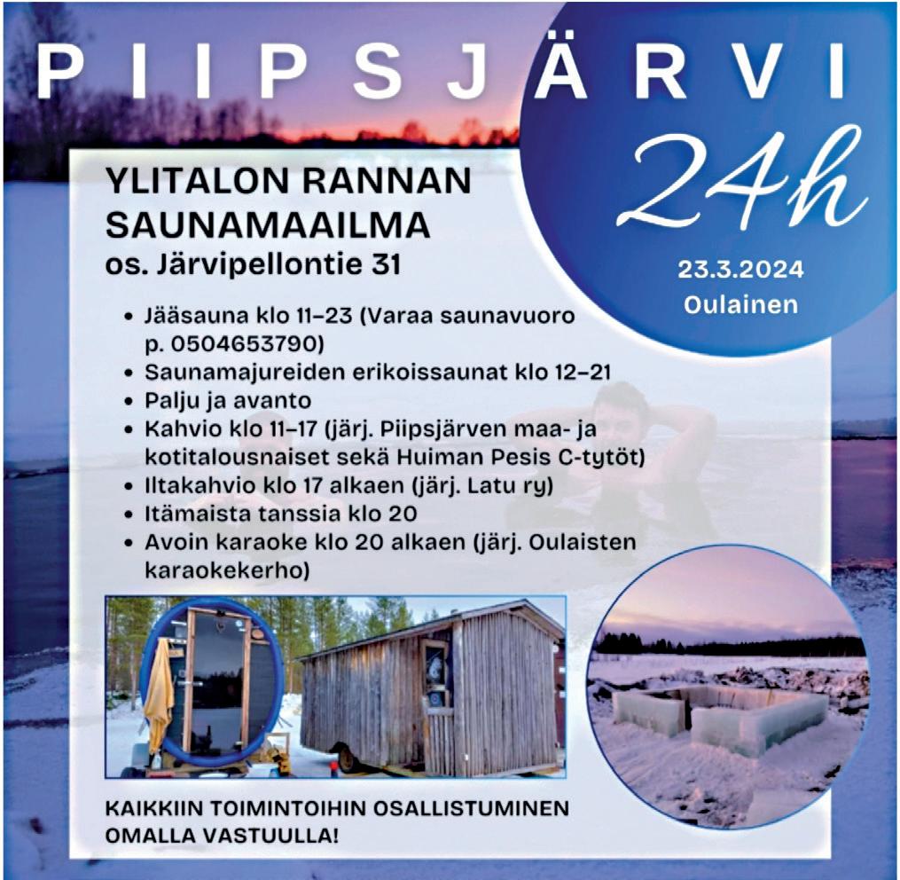 5G Ilmainen liittymän tarkistus! SE TOIMII VEIKON KONE OULAINEN Keskuskatu 11, 86300 Oulainen Puh. 08 473 740 Avoinna ma-pe 9-18, la 10-14 OULAISTEN VEIKON LIITTYMÄPÄIVÄT! Täydellinen tilaisuus siirtyä 5G-aikaan! • Jopa 100 kertaa nopeampi • Pienempi viive kuin 4G:ssä • Mahdollisuus käyttää useampia • samanaikaisia laitteita ilman • yhteyden hidastumista Liittymän ottajalle YLLÄTYSLAHJA JA LAHJAKORTTI! (Lahjakortin arvo jopa 50€) Kahvitarjoilu! LIPPU 5€/KÄTEISMAKSU SISÄLTÄÄ KAHVIN JA PULLAN TANSSITTAMASSA OULAISTEN KARAOKEKERHO SEKAHAKU LAUANTAINA 23.3.2024 KLO 16:00-19:00 PIIPSJÄRVEN NUORISOSEURANTALOLLA TANSSIT Nuorisoseurantie 81 86300 Oulainen Opti-Aika Järvelä, Oulainen Oulaistenkatu 24 ma-pe 9.30-17, p. (08) 470 016, 050 5017 342 • fennooptiikka.fi Opti-Aika Järvelä nettiaika.fi/ OptiAikaOulainen tai soita 0,Varaa aika optikolle! 24 kk kulutonta maksuaikaa Linssitarjous! tai AURINKOLASIT kaupan päälle OSTAESSASI SILMÄLASIT Ei voi yhdistää muihin tarjouksiin, ei koske aiemmin tehtyjä tilauksia. TOINEN LINSSI www.varaamokki.com info@varaamokki.com Puh. 050 543 6605 Myös tekstiviestit ja WhatsApp-viestit Loma-asunto Tähtisara