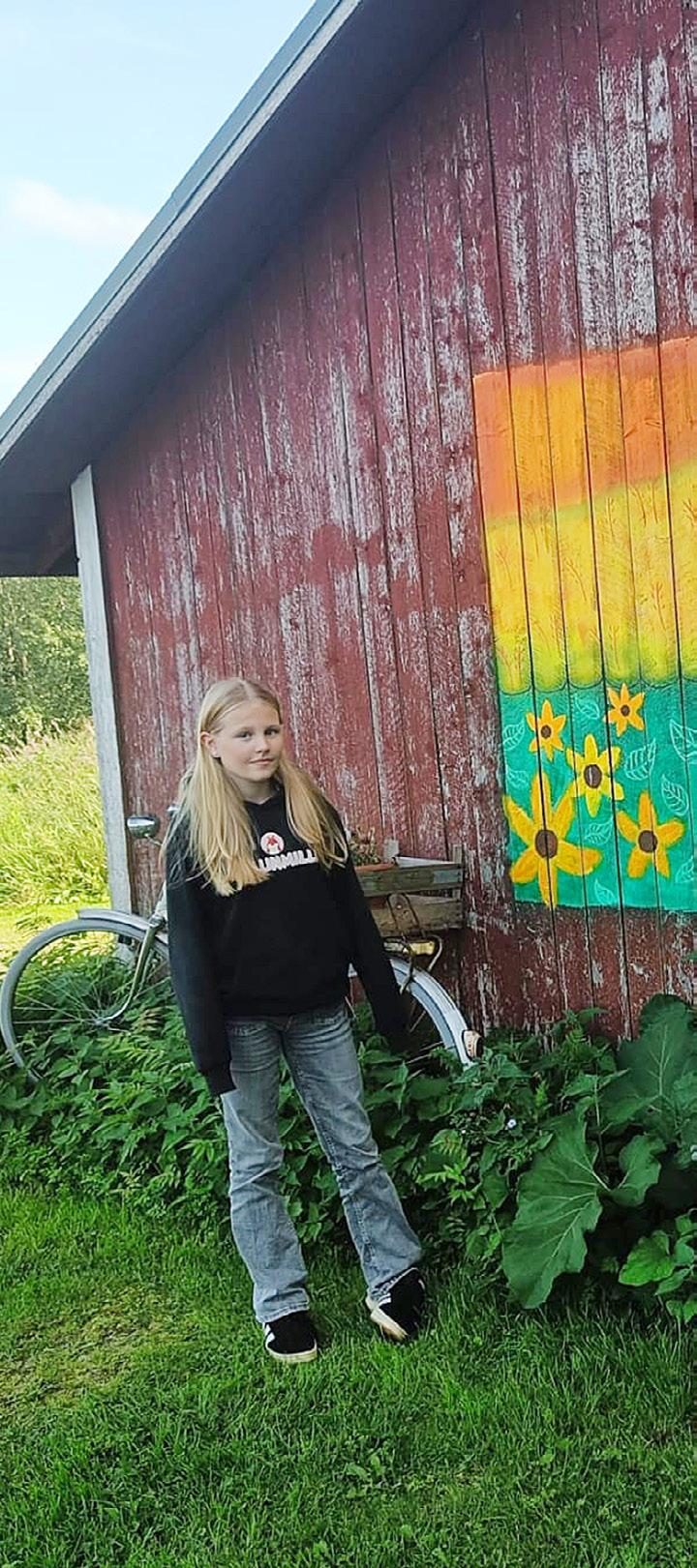 ”Maalla on kaikkialla luonnossa hienoja värejä ja siksi tein kuvasta värikkään. Kotona meillä ei ole lehmiä eikä kanoja, mutta kavereiden kotona on ja niin ne olivat helppoja piirtää. Tietysti olin iloinen, kun maalaukseni voitti ja sain vielä olla sitä sinne ladon seinään tekemässä. Mukava se on, kun kaikki tiellä kulkevat näkevät sen”, Anna Sotaheimo iloitsee.